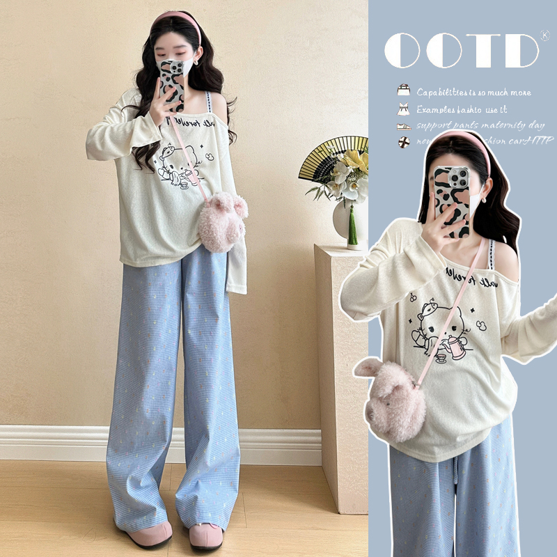 松紧腰阔腿长裤 孕妇春夏装 露肩上衣 两件套 2025新款