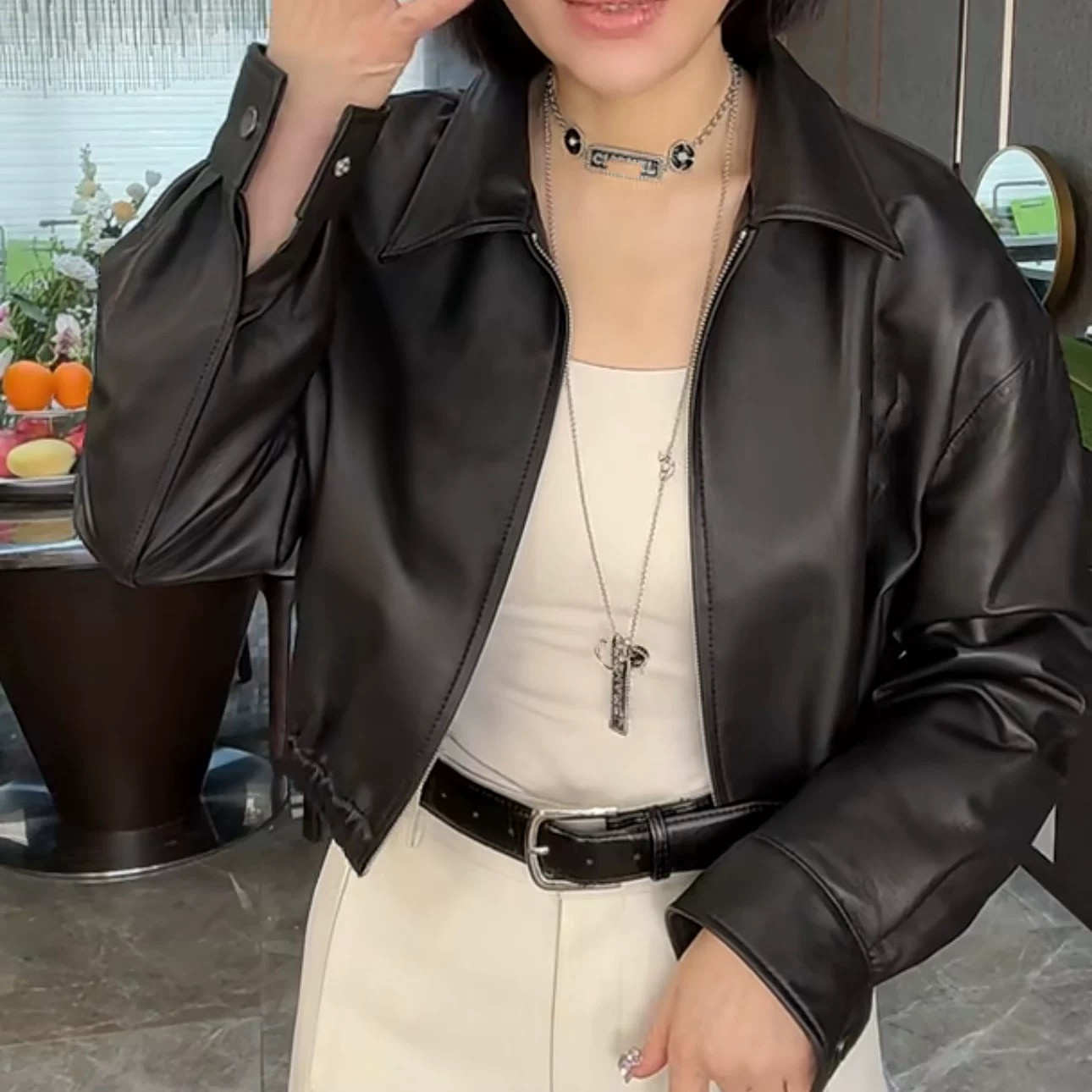 2024秋冬新款 绵羊皮小众设计感黑色方领休闲减龄皮夹克真皮皮衣女