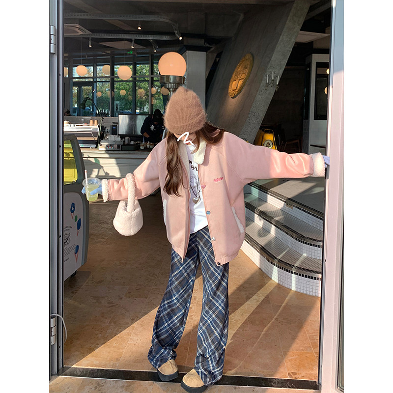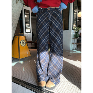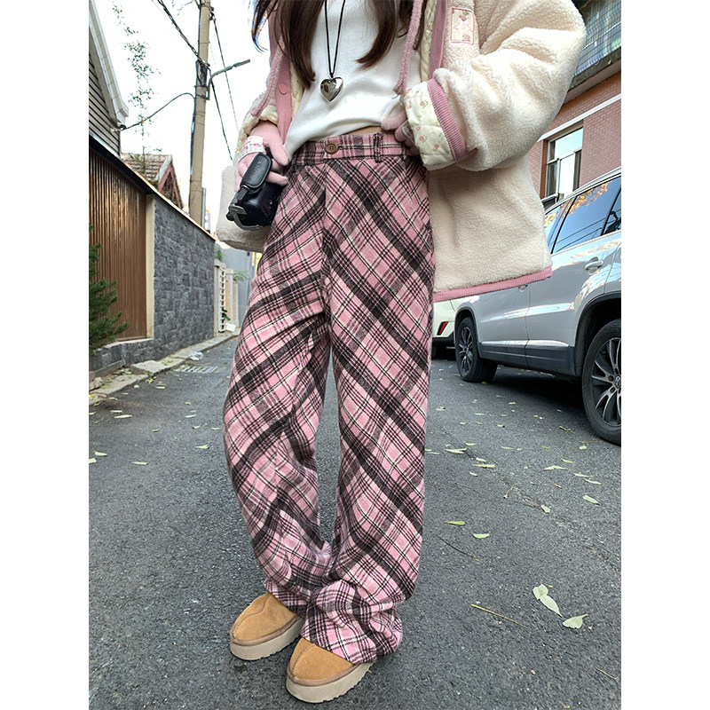 现货 直筒格子休闲阔腿裤 格纹磨毛加绒微喇长裤 新款 女 2025冬季