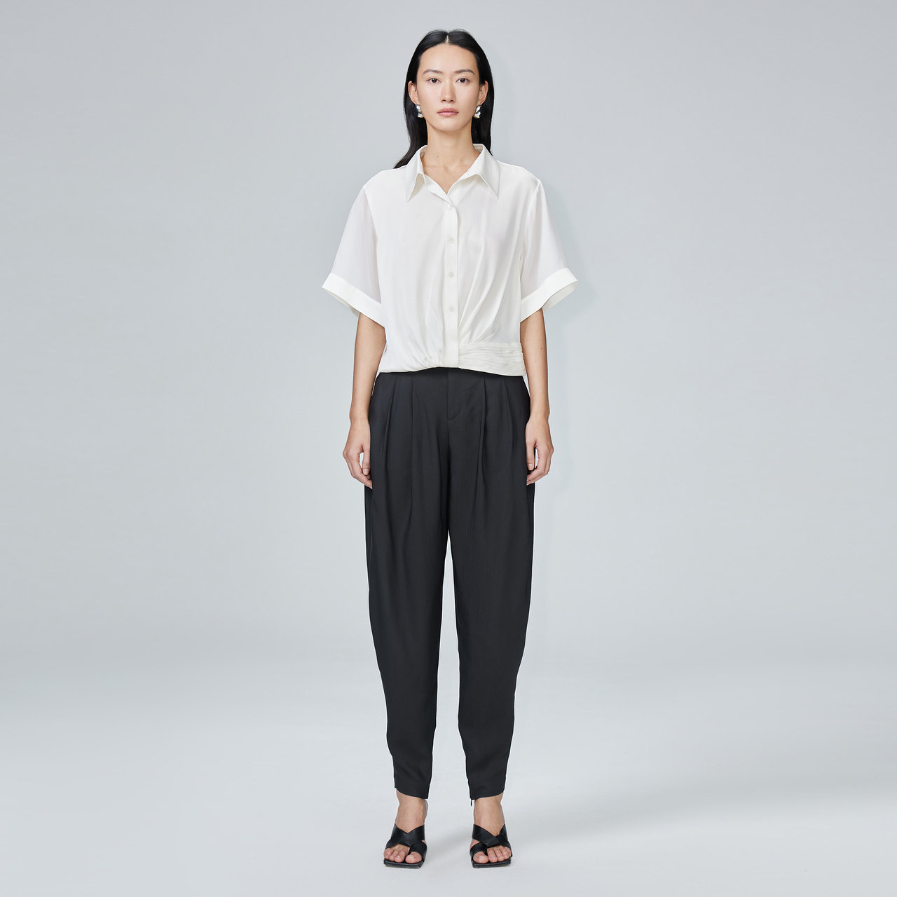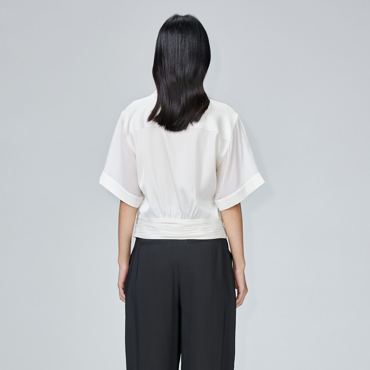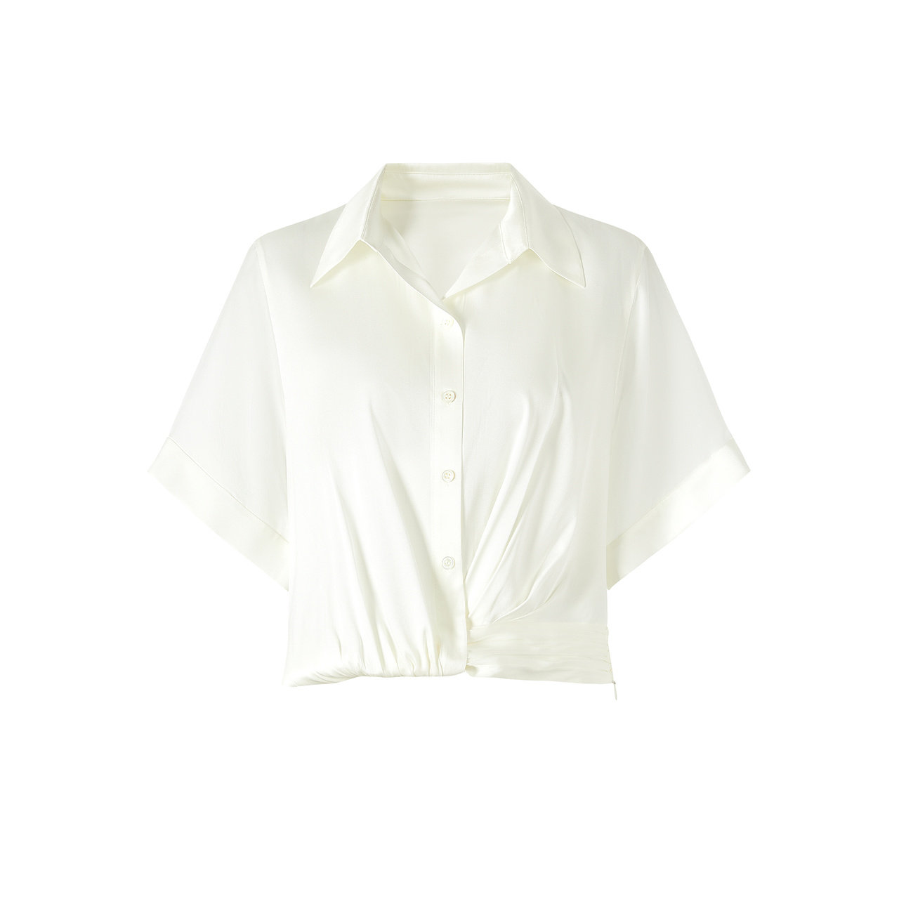 IMM尹默桑蚕丝19MM直条缎奶白色极简风纽结下摆短袖 上衣女 衬衫