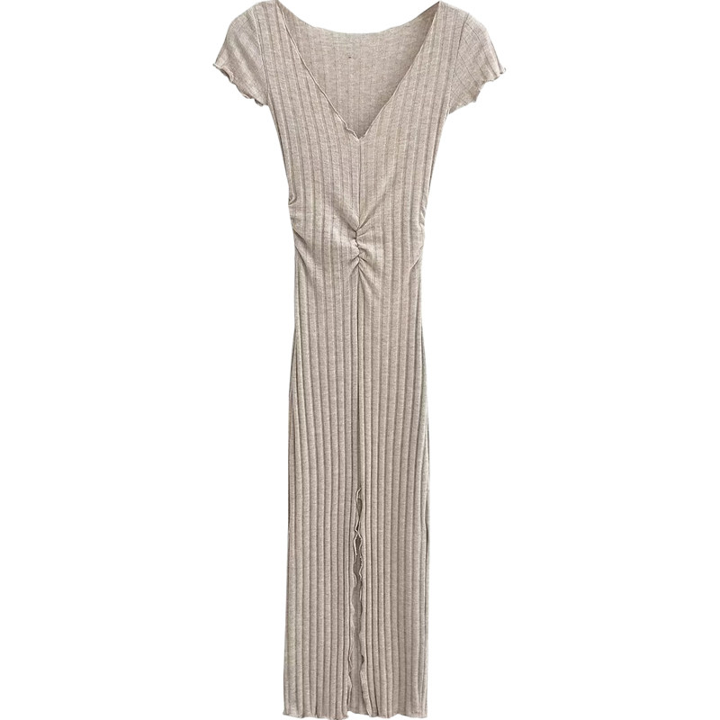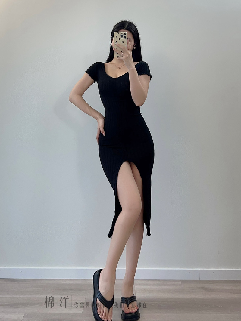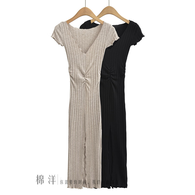 棉洋复古木耳边性感短袖 弹力连衣裙收褶前开叉辣妹后妈打底中长裙