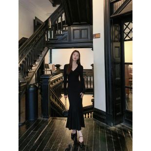 显瘦性感气质包臀鱼尾裙长裙 修身 MULVAN 黑色针织v领连衣裙女长袖