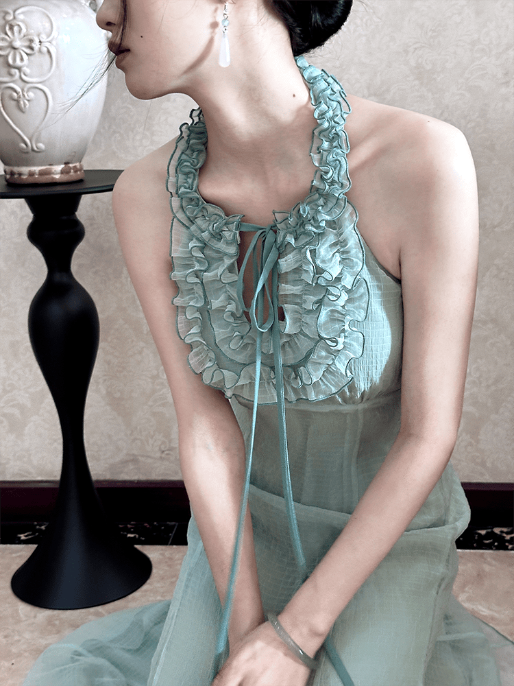 Lili百合乡原创仙气挂脖鱼尾裙夏少女感木耳边连衣裙 薄荷曼波