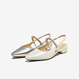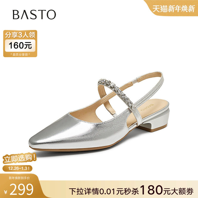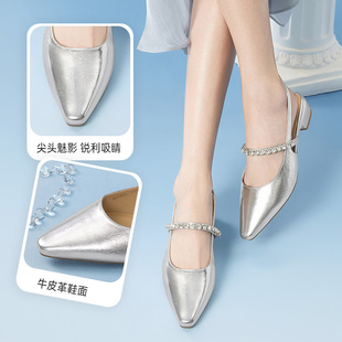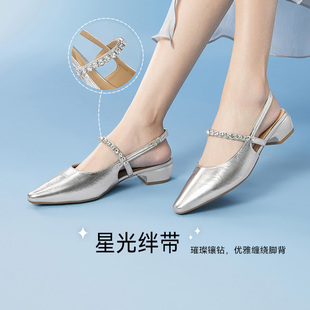 BN956BH5 银色单鞋 百思图2025夏新款 气质尖头粗跟后空女玛丽珍凉鞋