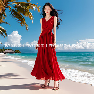 V领薄纱红色背心连衣裙女夏收腰礼服裙海边度假长裙沙滩裙大摆裙