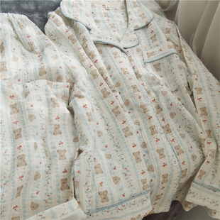 纯棉双层纱布睡衣家居服长袖 治愈系小熊蓝色清新女生春夏秋 长裤