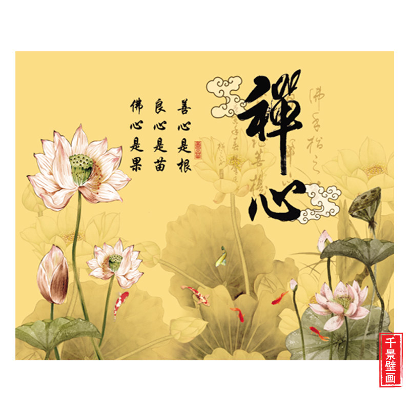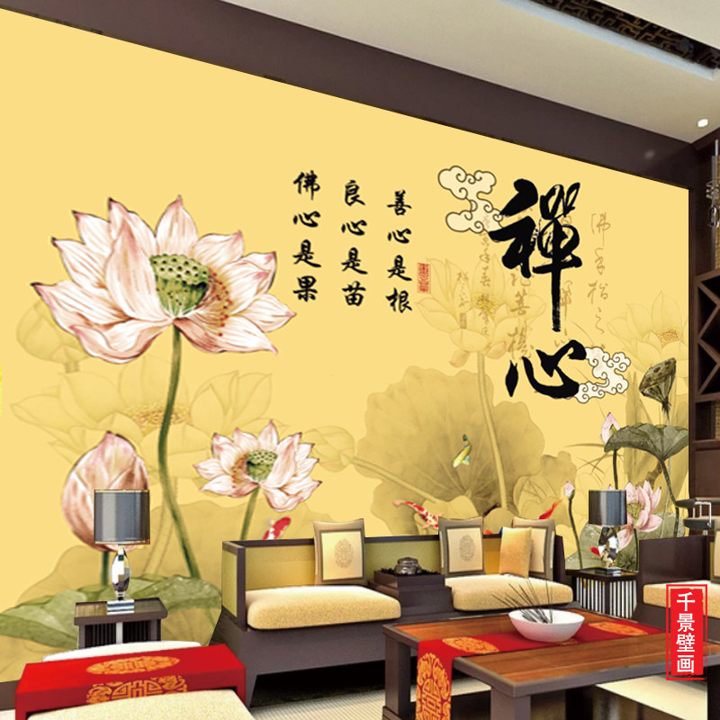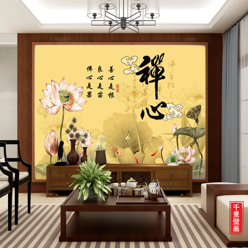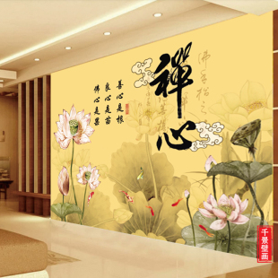 荷花墙纸养生茶馆美容酒店玄关佛堂背景墙布禅心禅意定制壁画贴纸