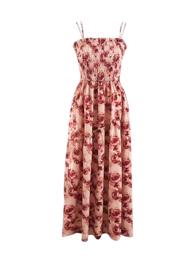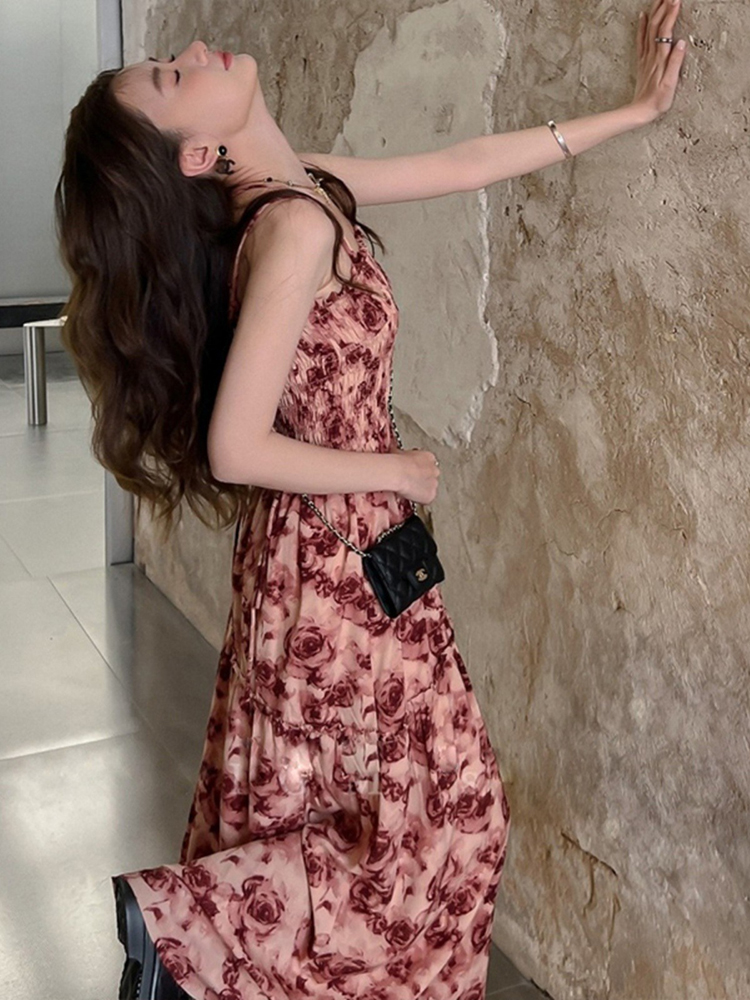 茶歇甜美一字领收腰长裙 新款 法式 碎花裹胸吊带连衣裙女2025夏季
