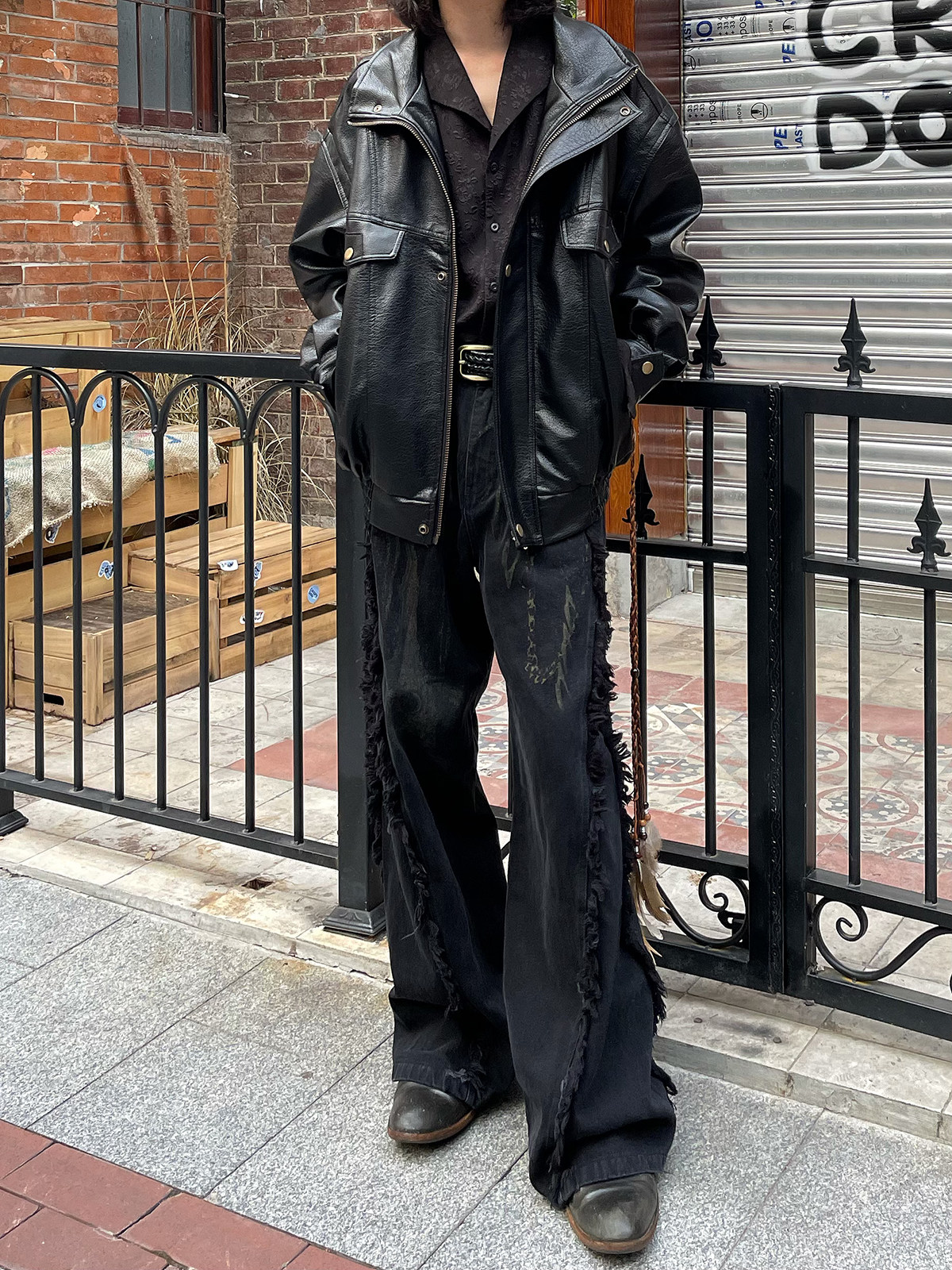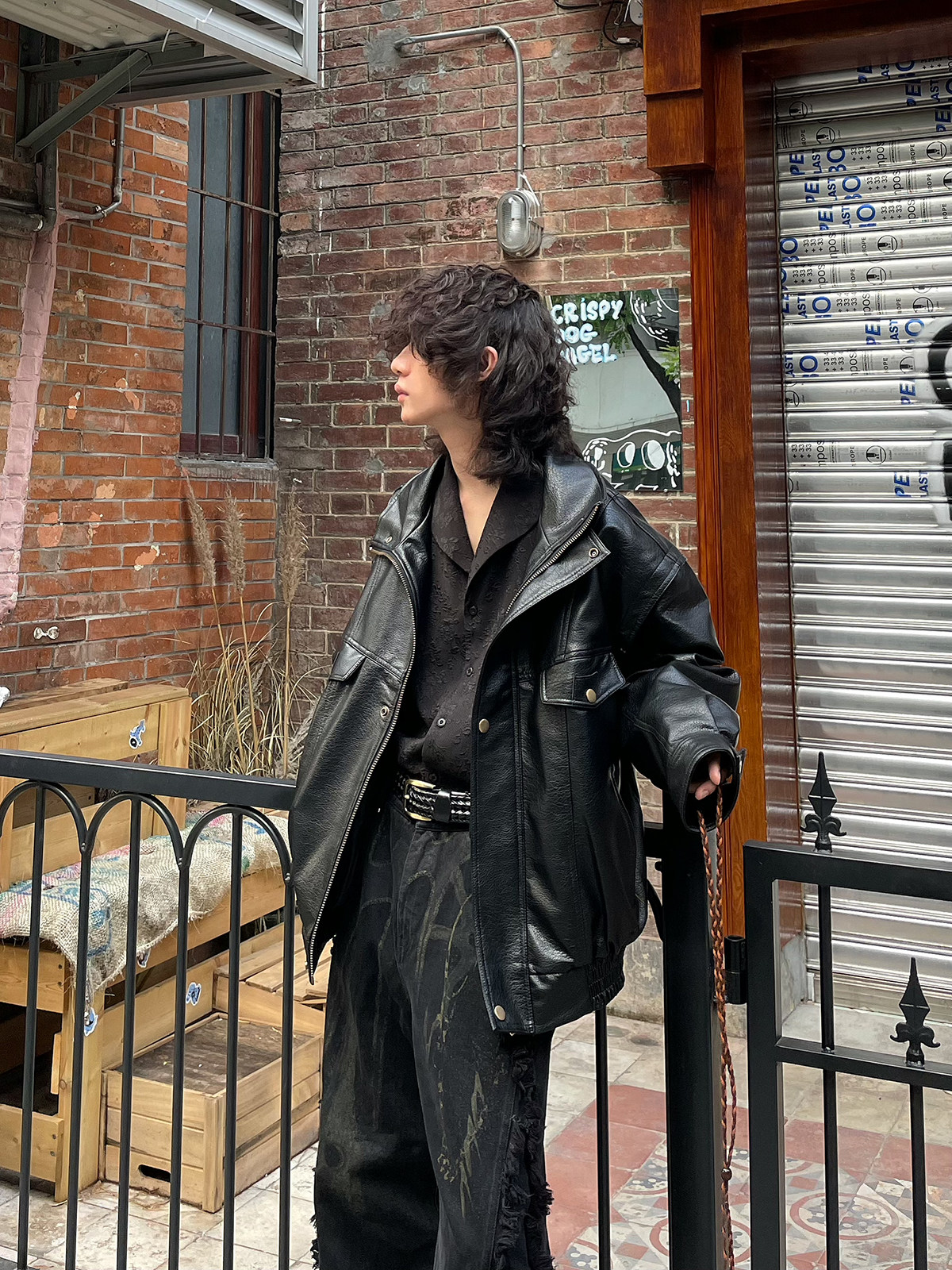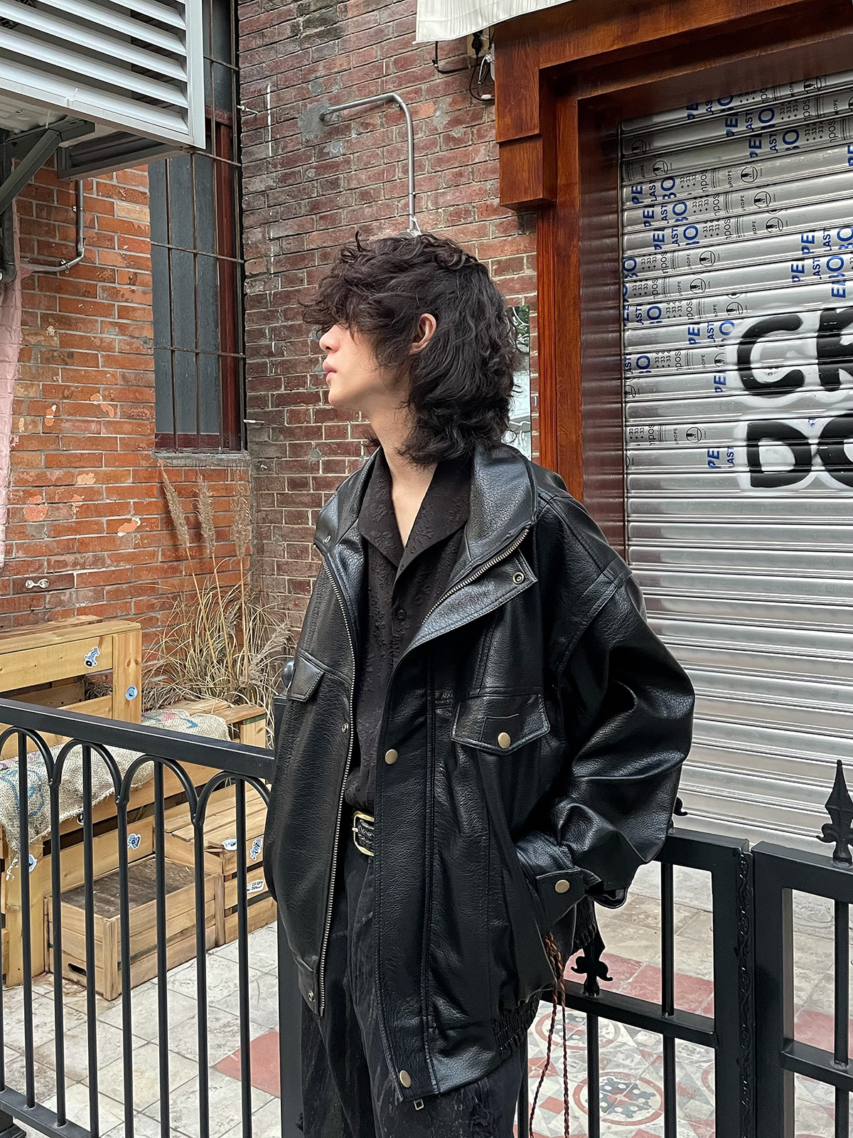 以休眠 复古小众重磅高级感宽松黑色机车皮衣夹克外套男女