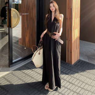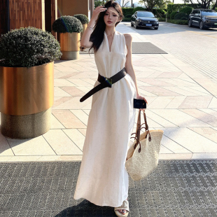 黑色高级感V领挂脖连衣裙女春夏穿搭2026新款 气质收腰显瘦A字长裙