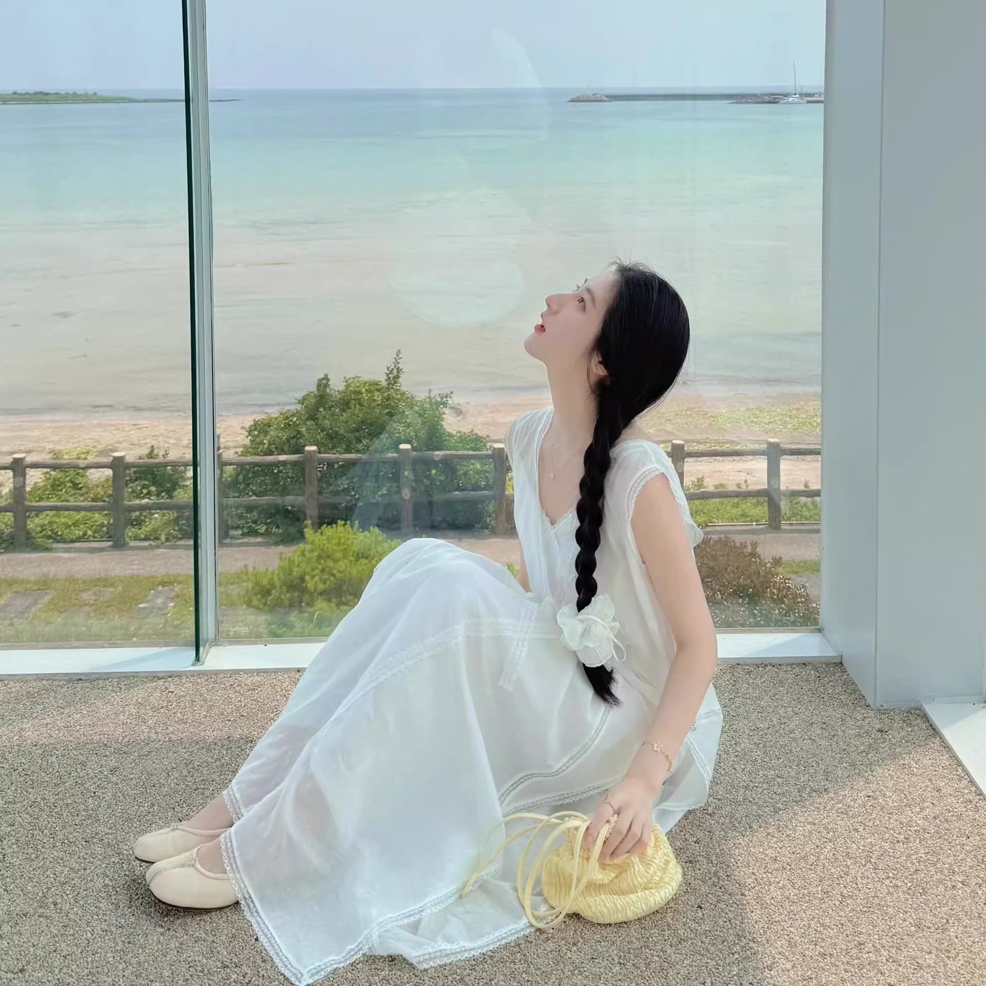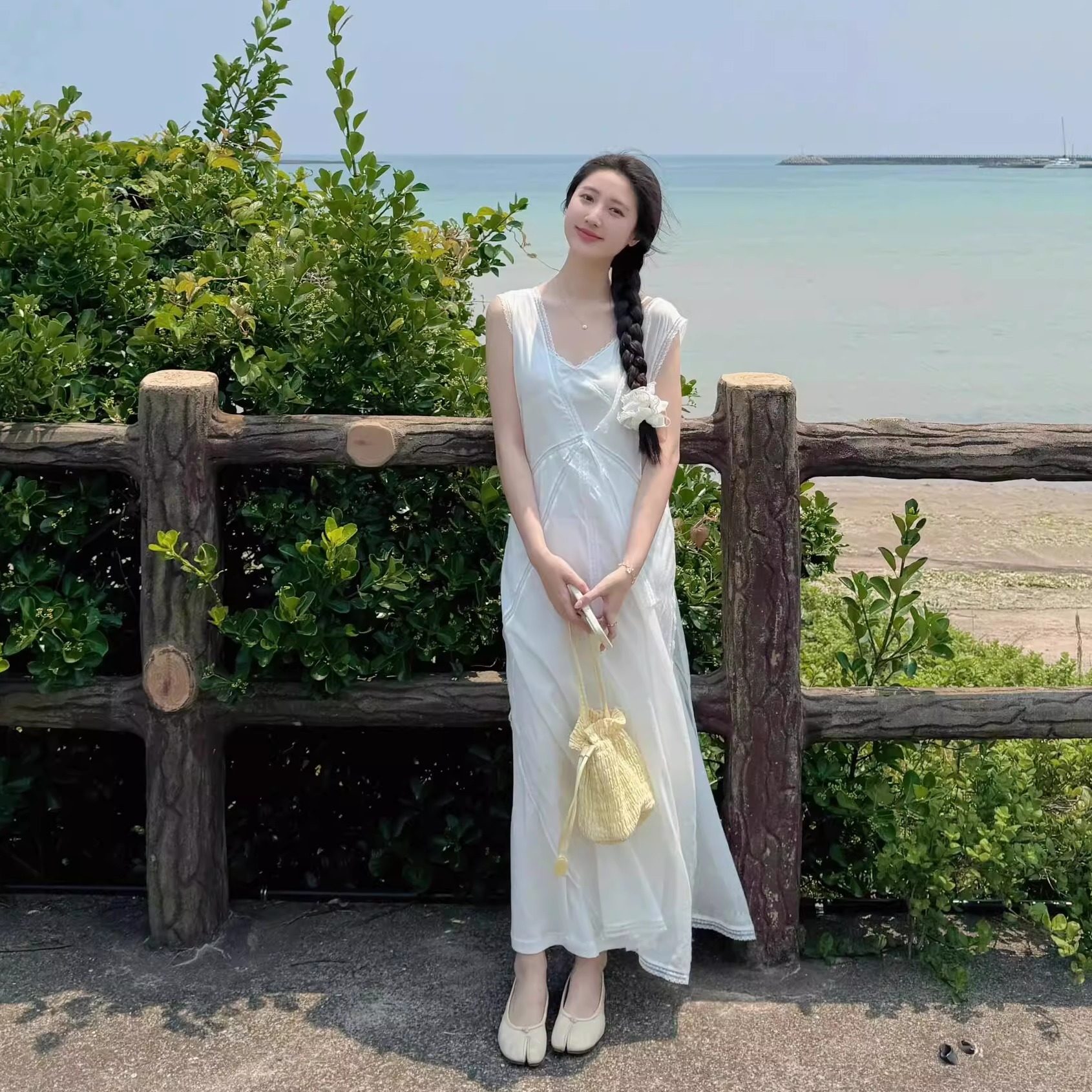 背心裙高级感长裙 连衣裙气质V领无袖 SerOra 白色双层刺绣蕾丝法式