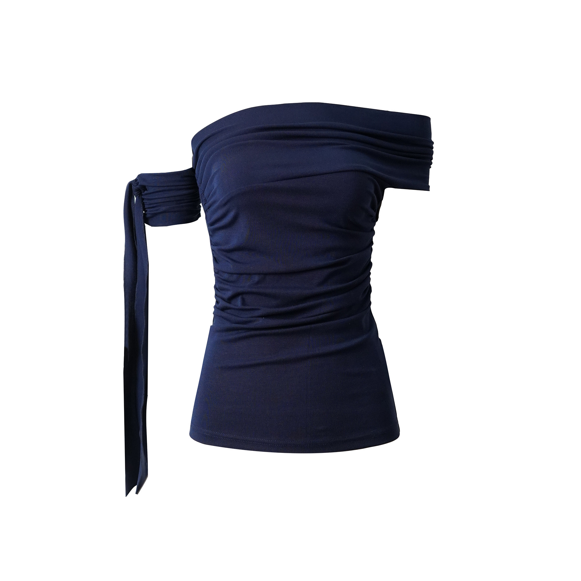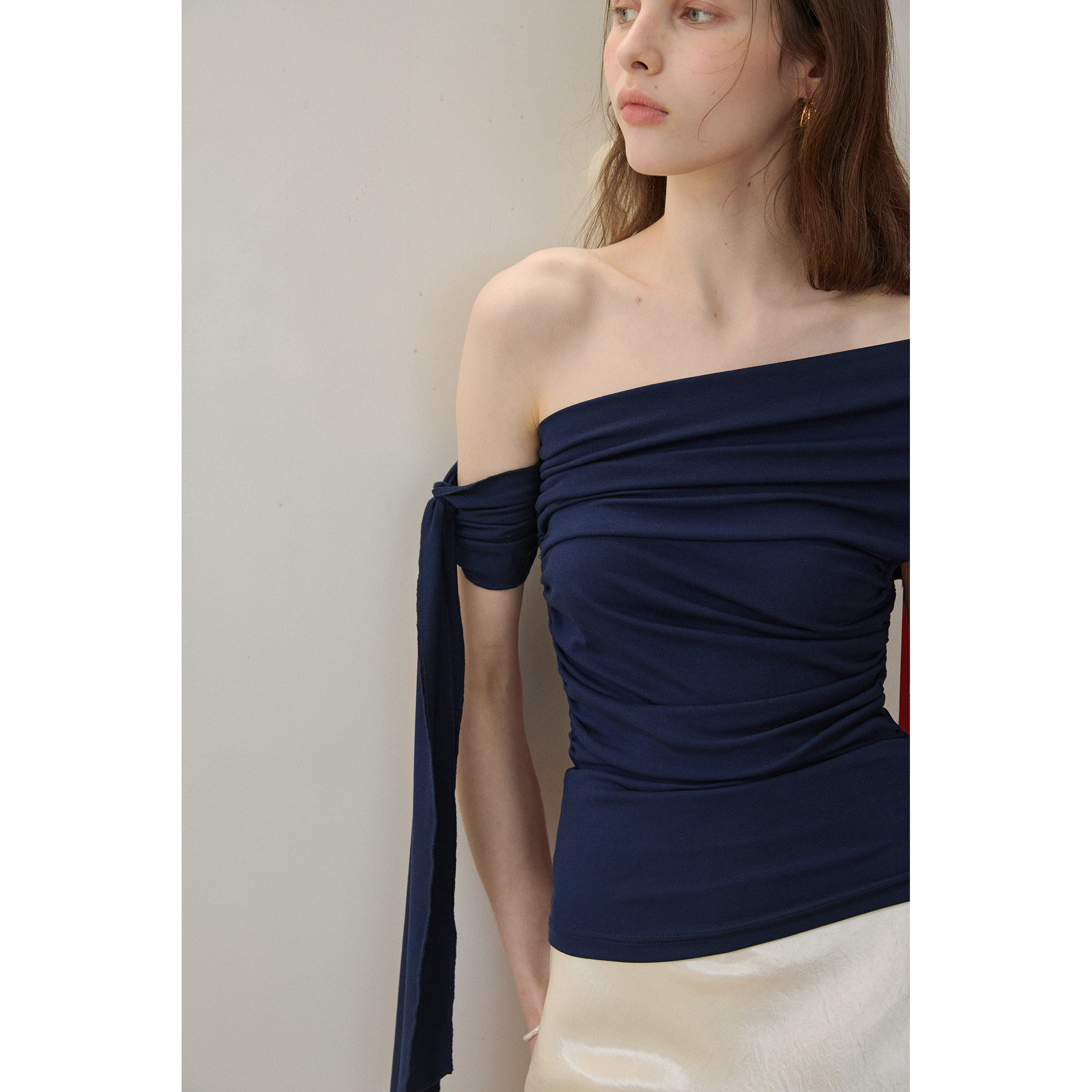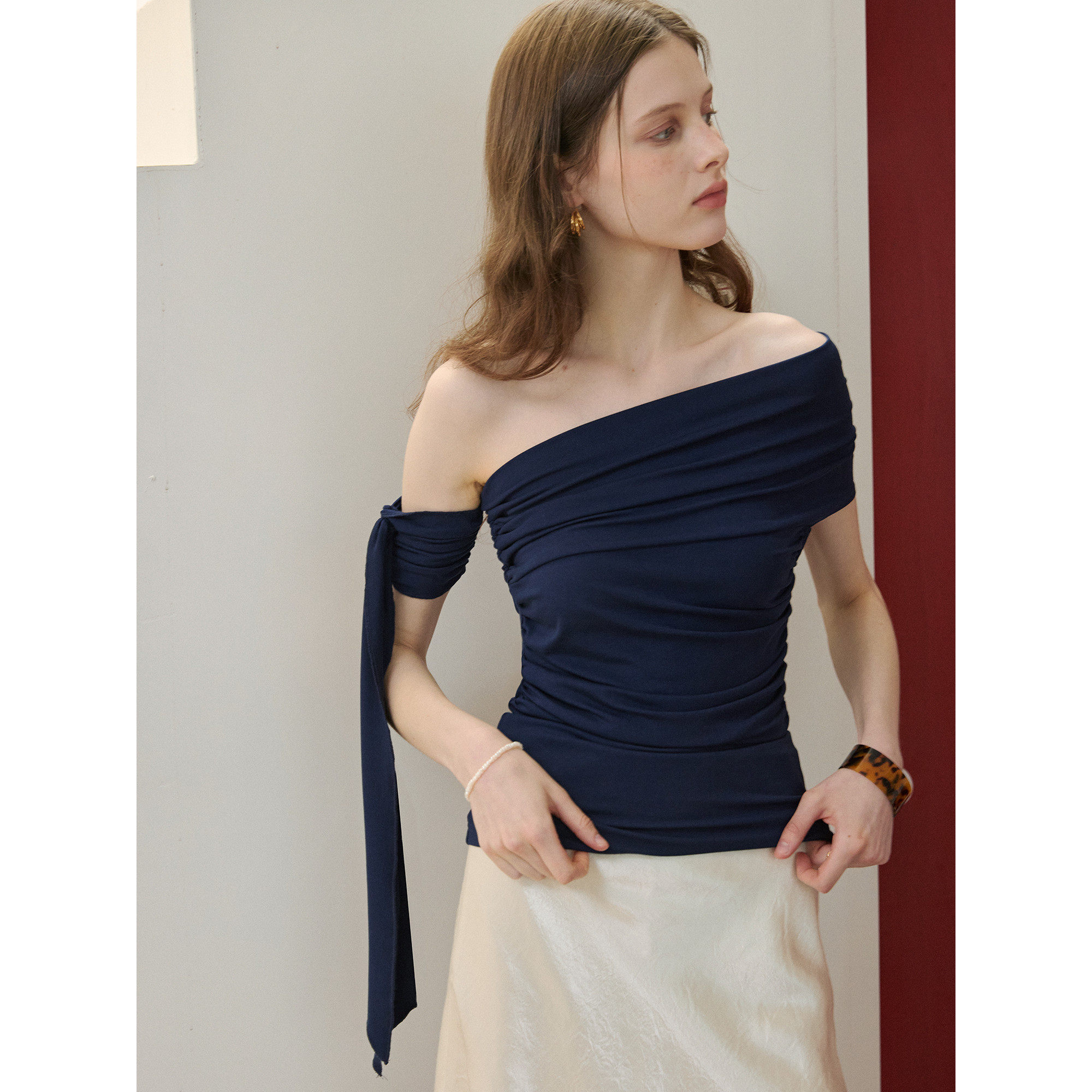 甜辣天丝一字领斜肩设计感不规则飘带露肩修身 T恤女夏小性感上衣