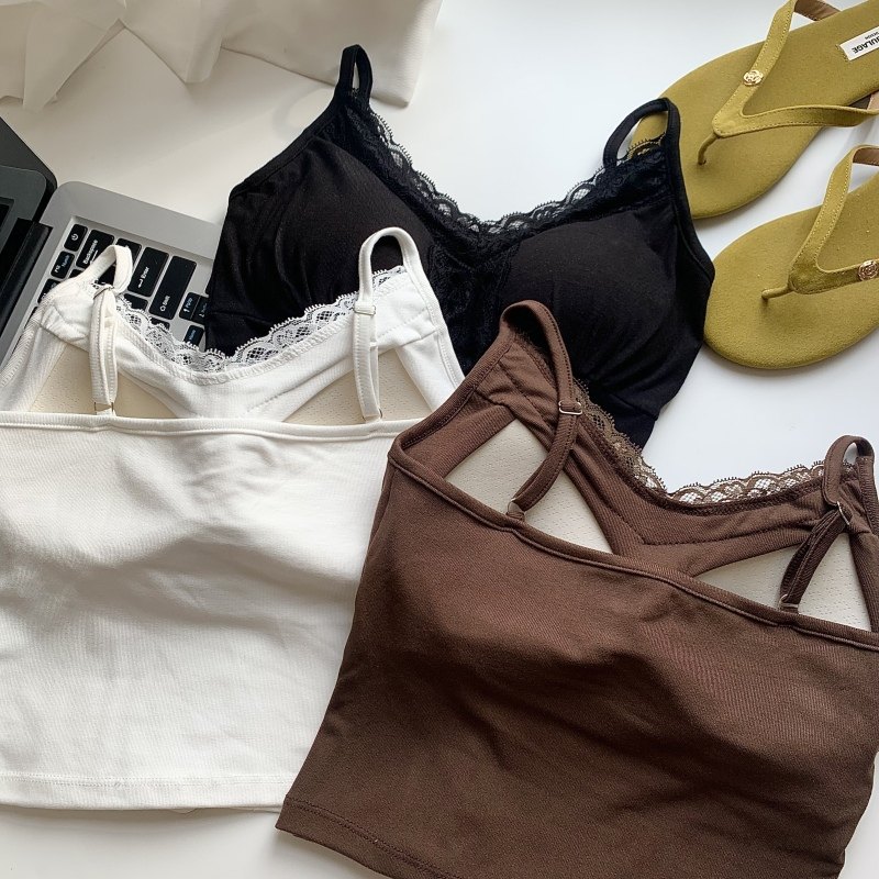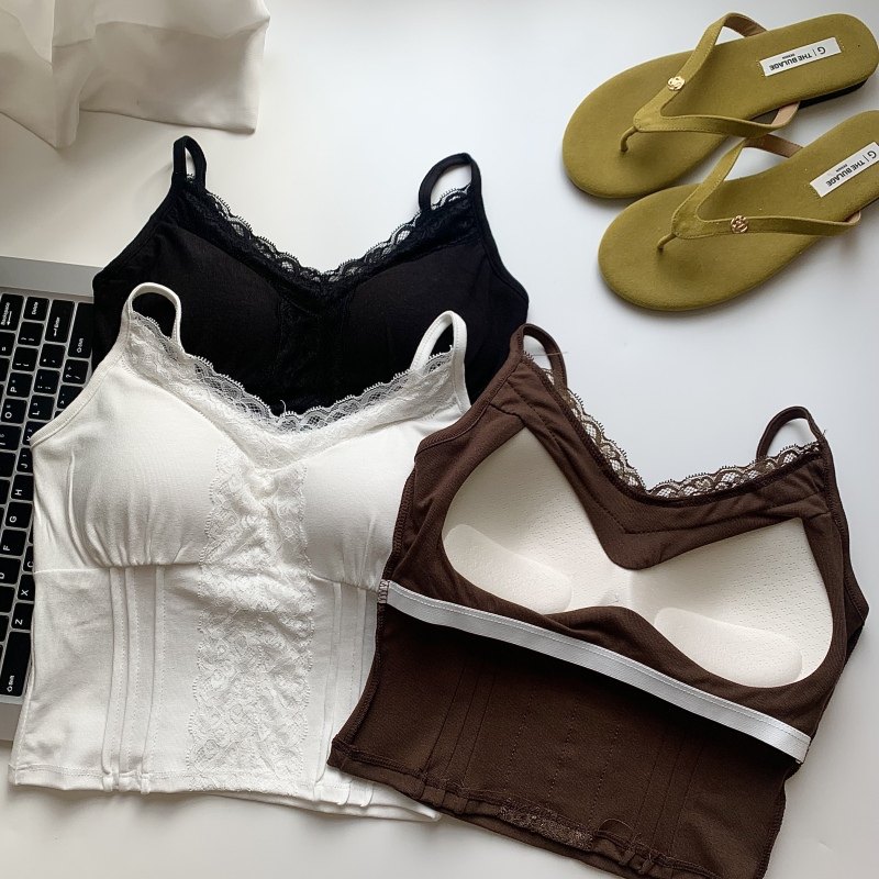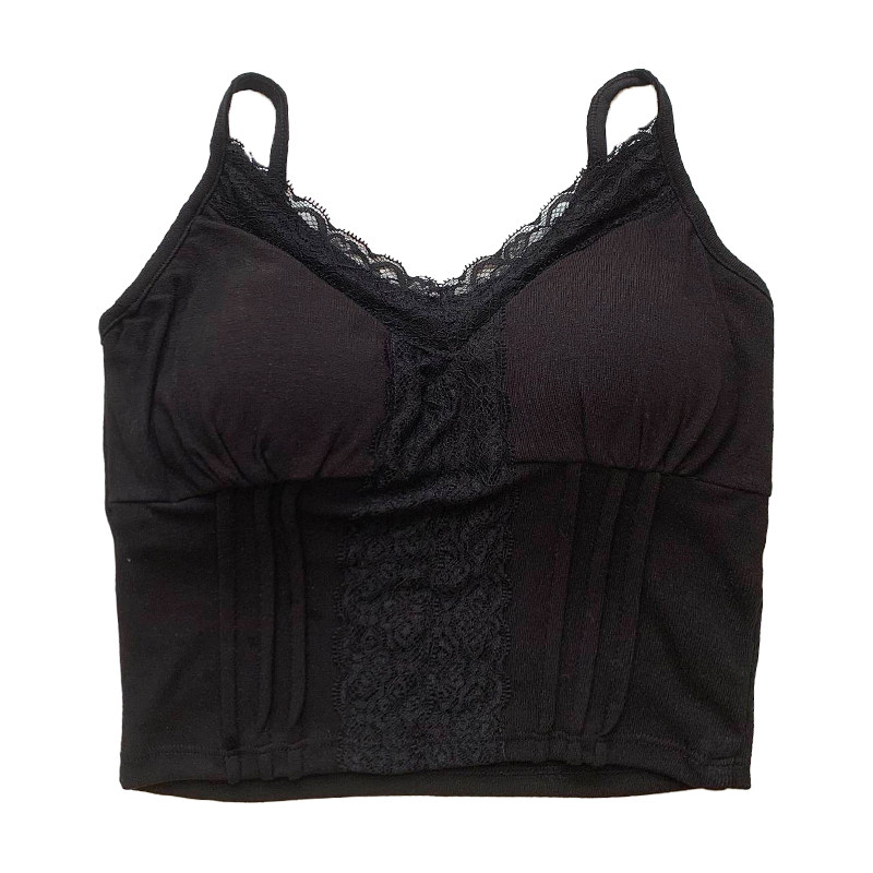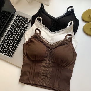 少女纯欲蕾丝拼接显瘦修身 吊带背心自带胸垫性感V领内搭打底上衣