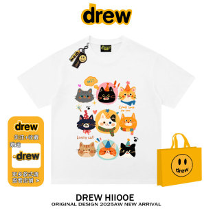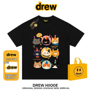 drew美式 T恤男女宽松百搭情侣上衣 潮牌卡通可爱猫咪印花纯棉短袖