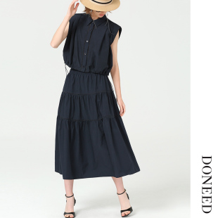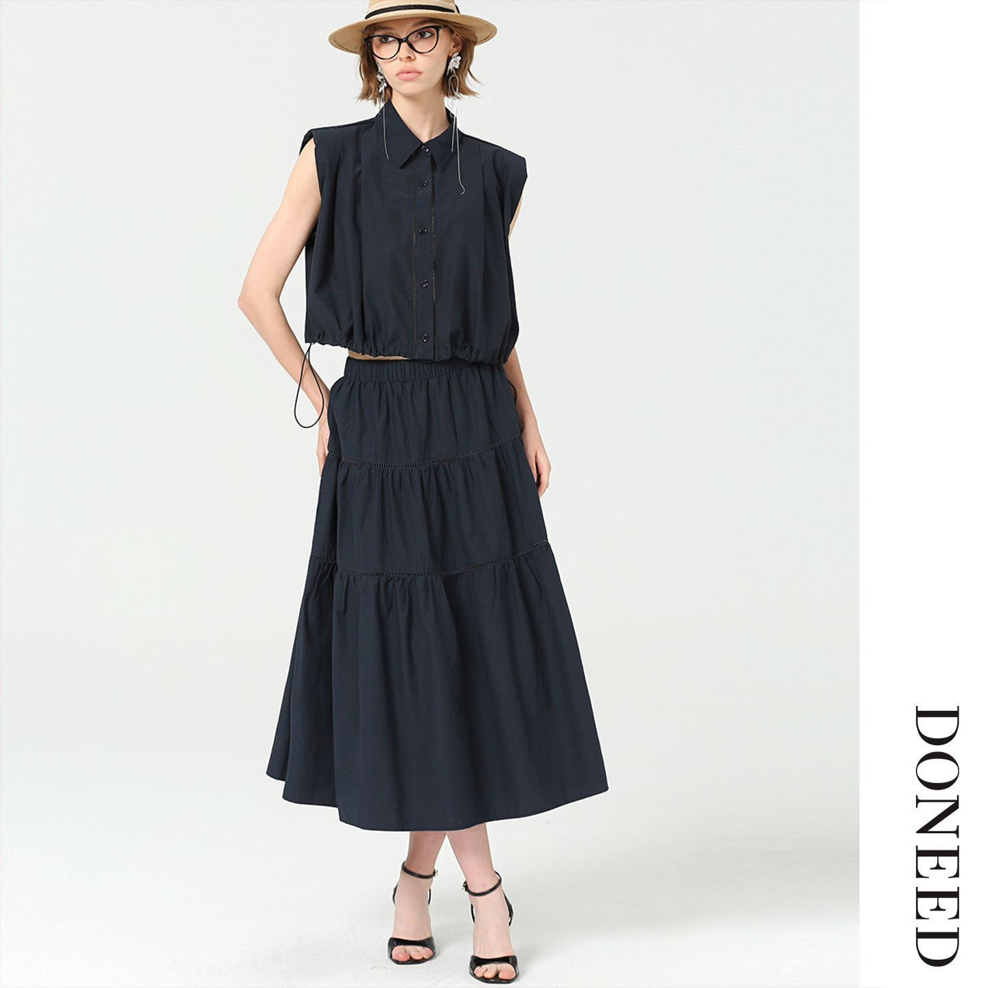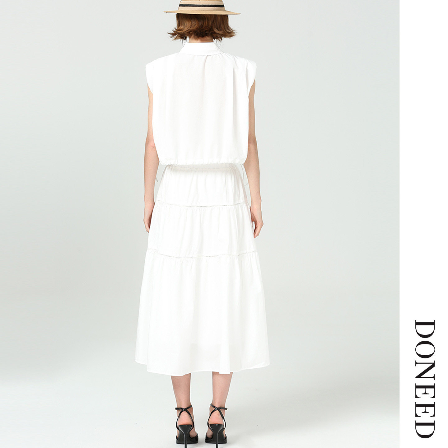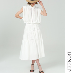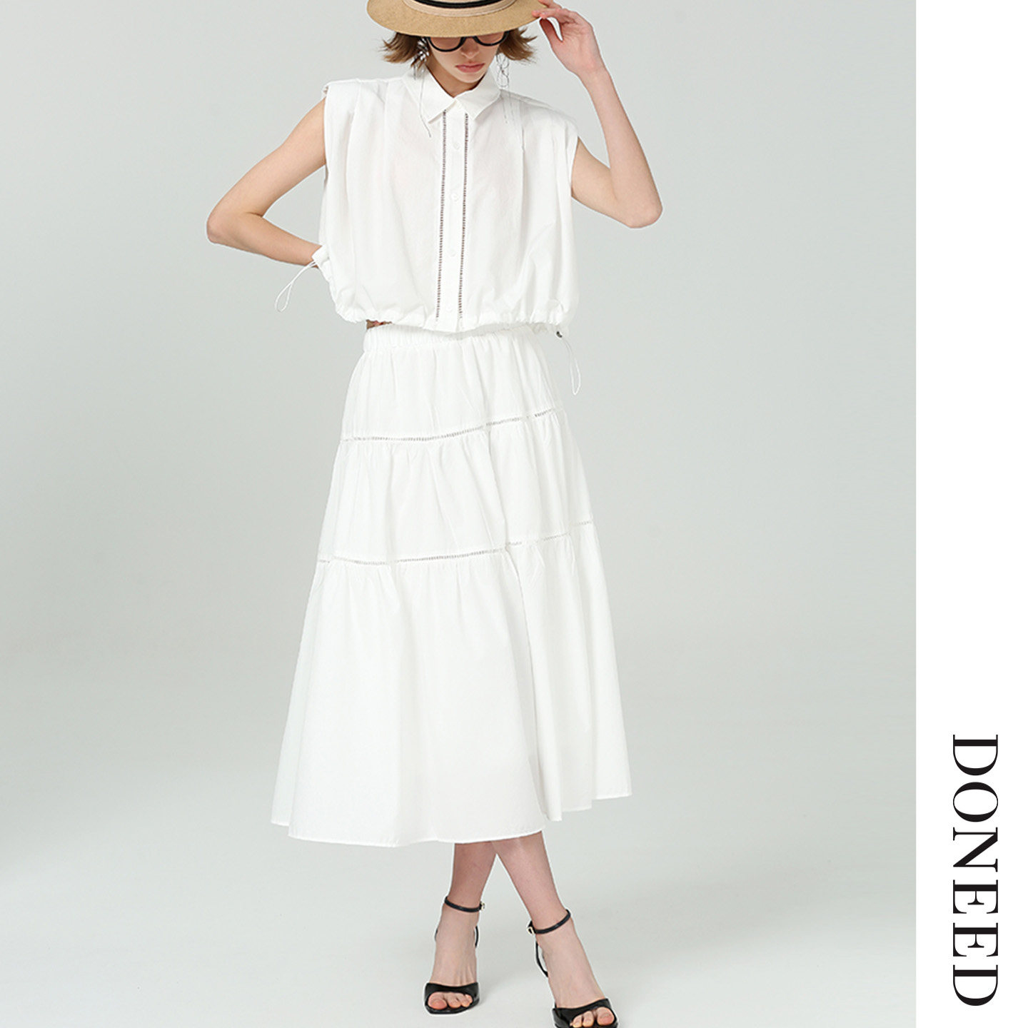 DONEED夏休闲翻领气质宽肩无袖 橡筋下摆A字半裙拼接蕾丝套装