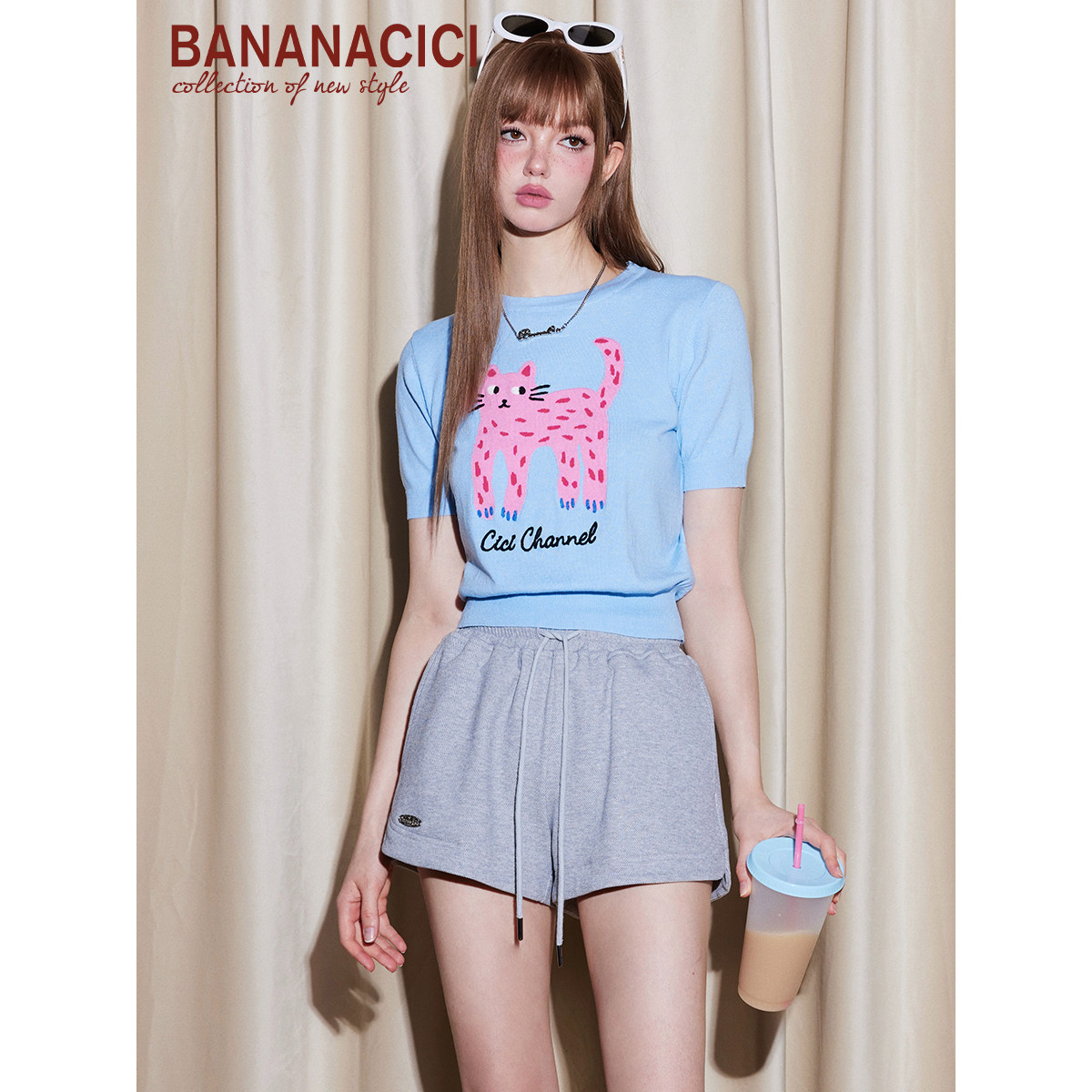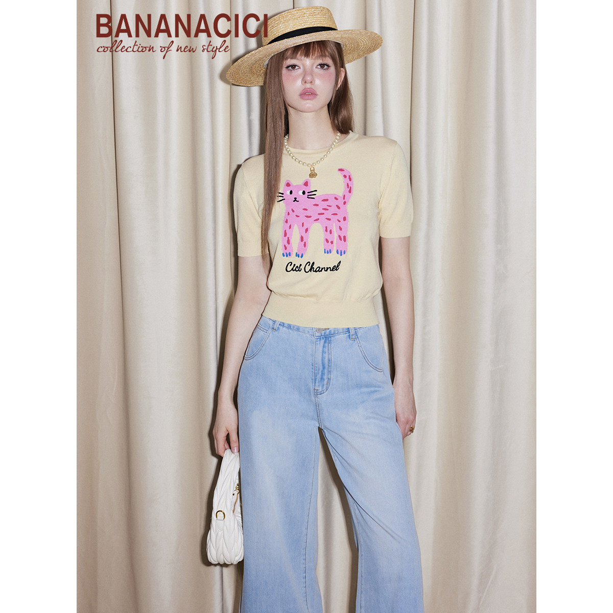 新款 CICI2026年夏季 BANANA 原创长腿猫绣花针织T恤 王冰冰同款