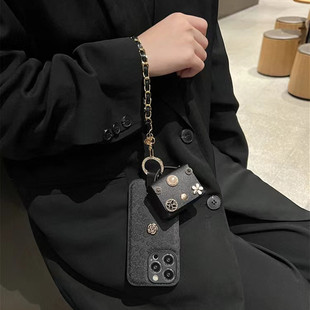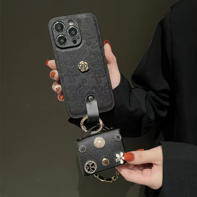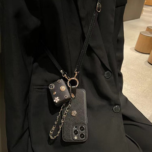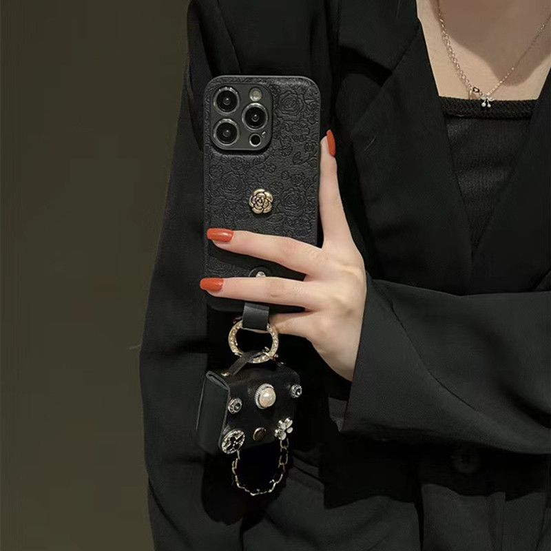 经典 nova12全包防摔软 黑皮质山茶花小香风包包适用iPhone16ProMax手机壳苹果17斜跨15华为mate60挂绳p70新款