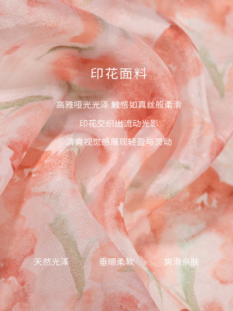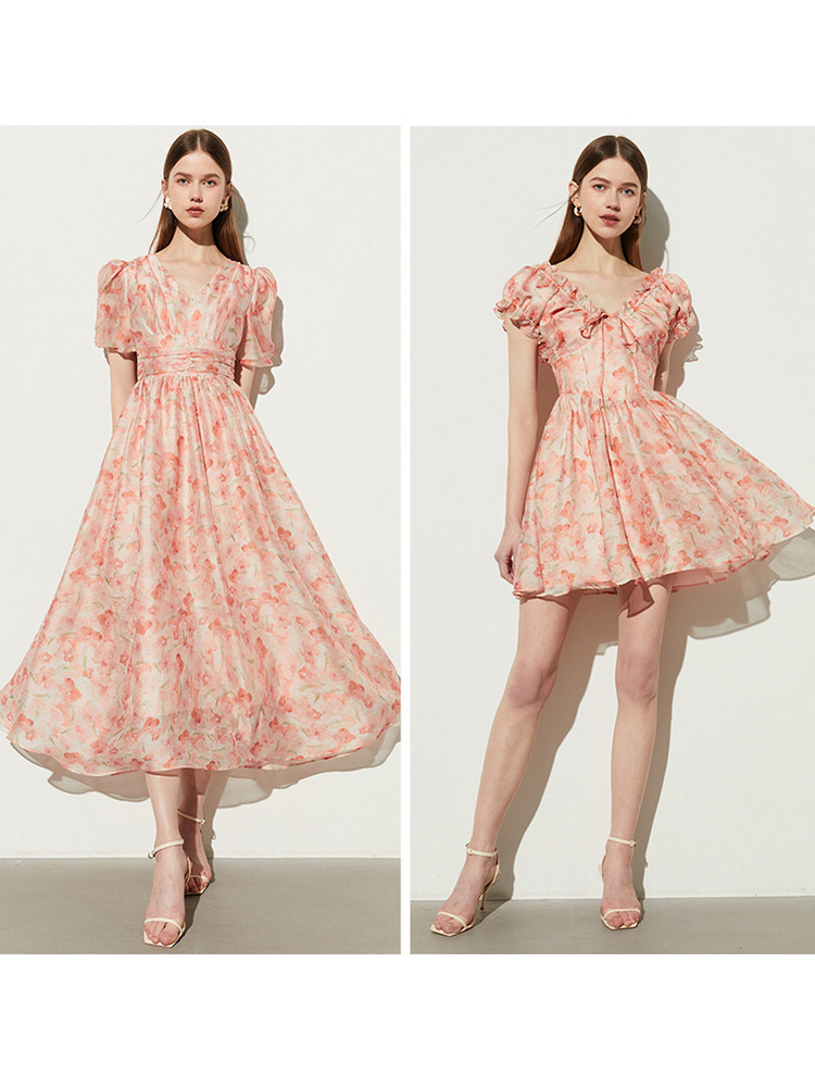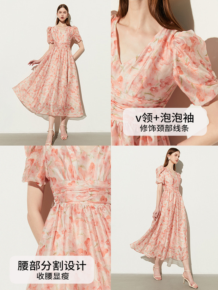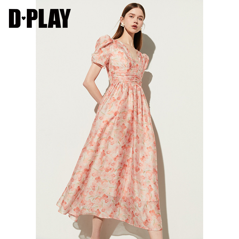 印花长裙粉色连衣裙女 海边沙滩裙泡泡袖 DPLAY夏季 气质法式