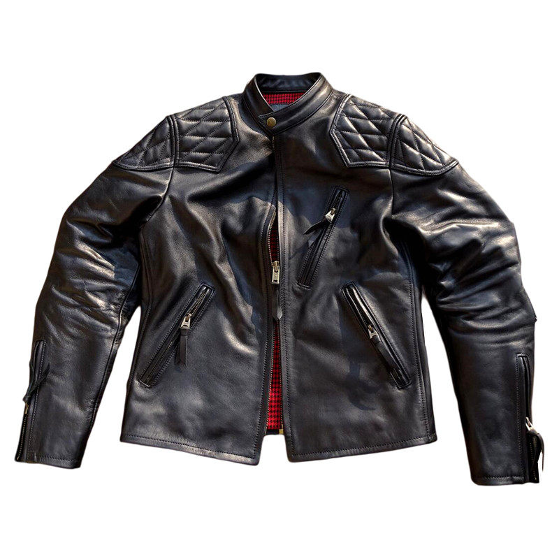 升级菱形格补强黑毒液贝克汉姆立领J100硬挺意产牛皮短款 机车皮衣