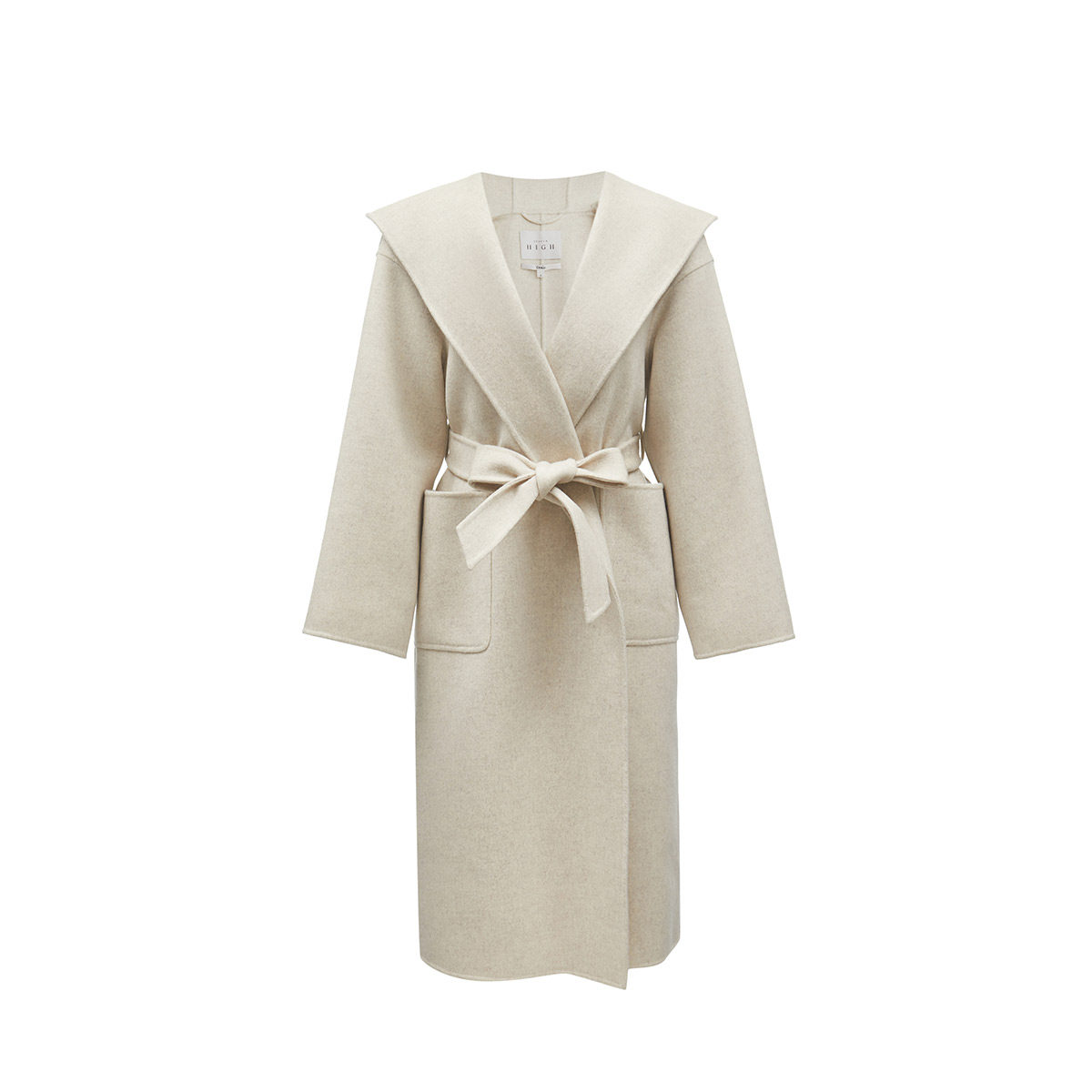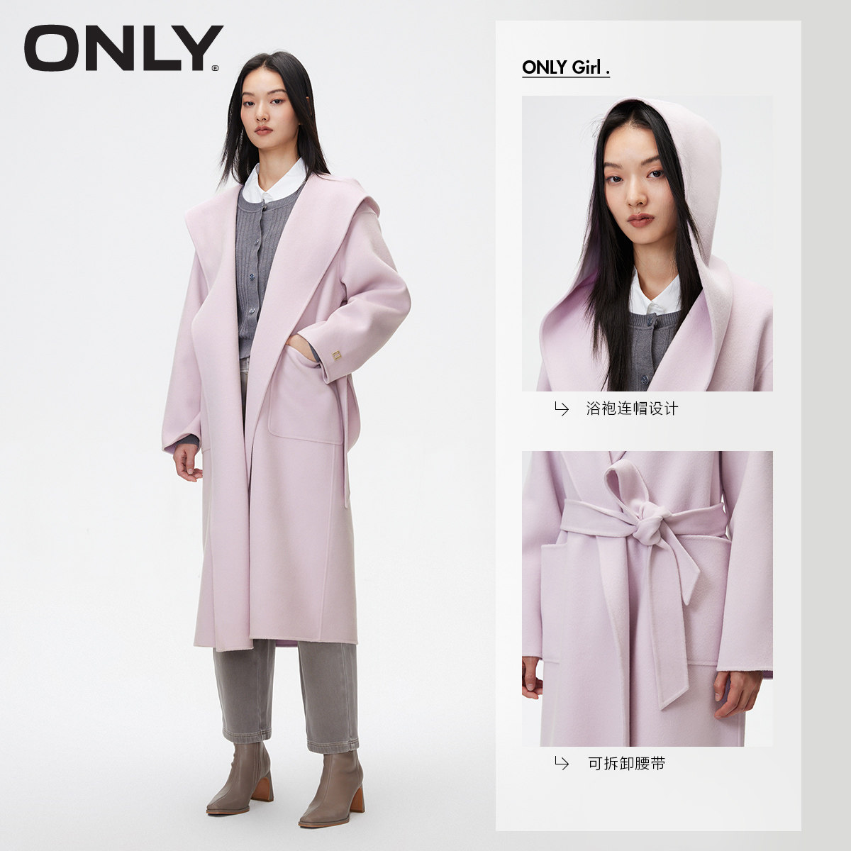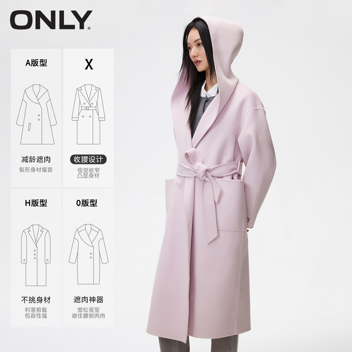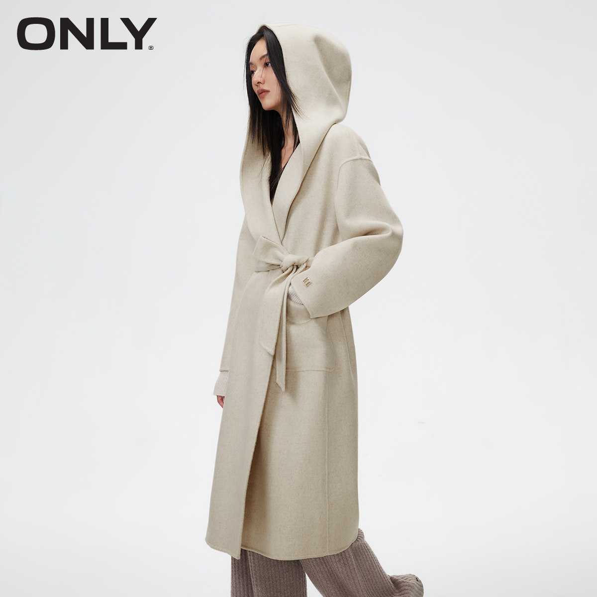 绫致ONLY冬双面呢含绵羊毛浴袍连帽设计收腰中长款 毛呢大衣女