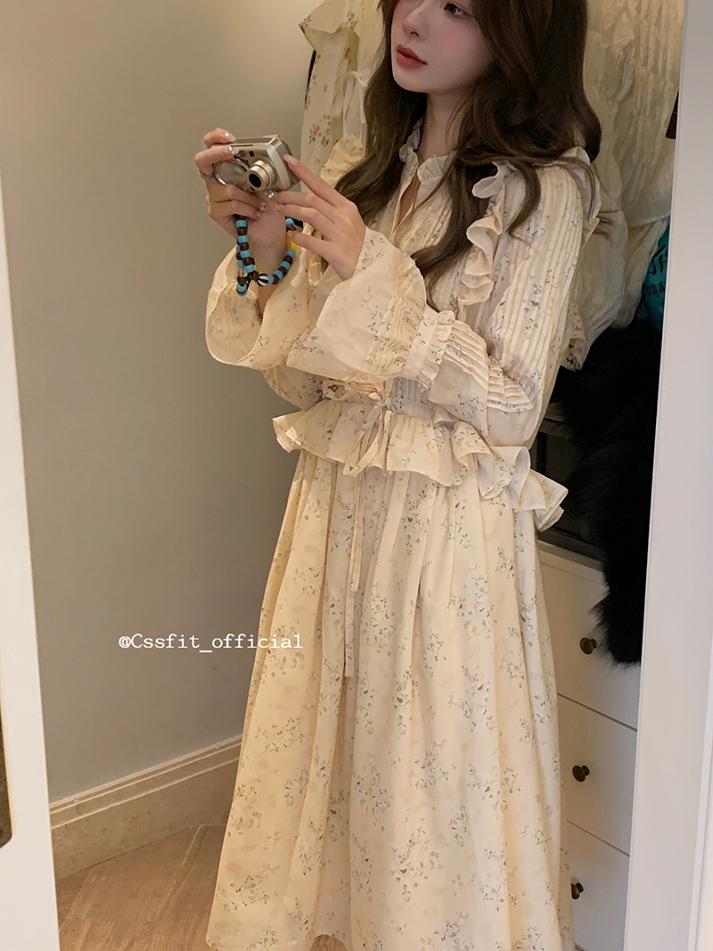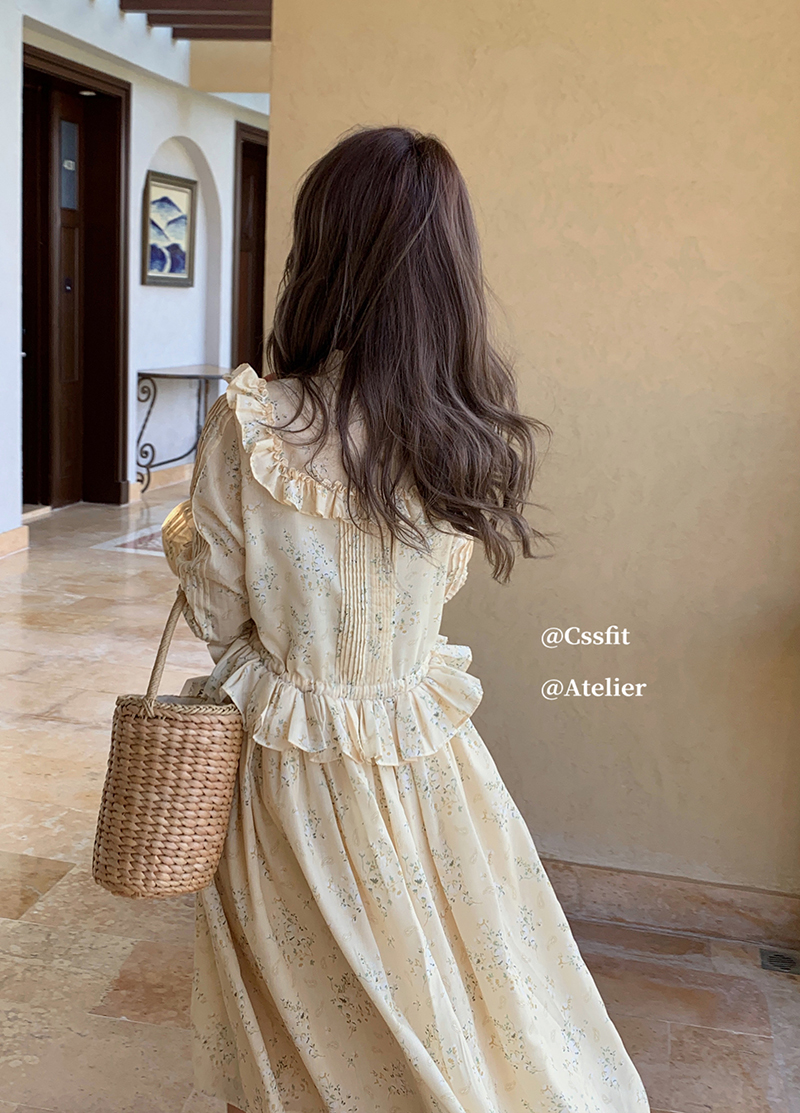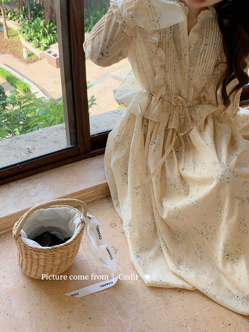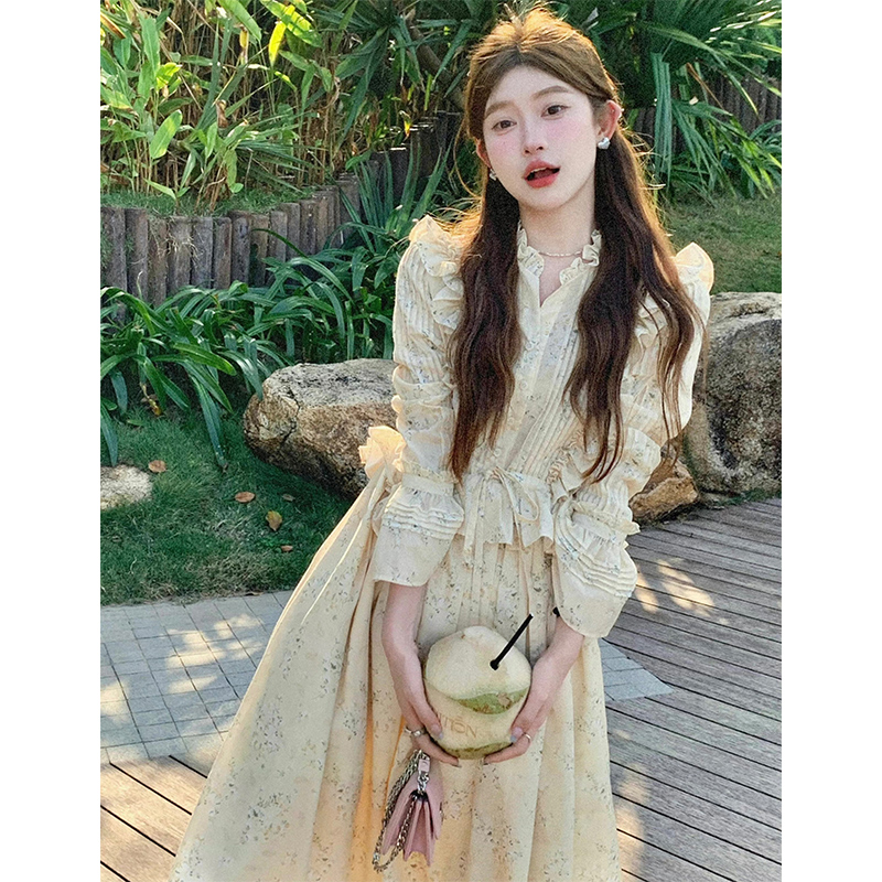 海岸精灵 荷叶边系带小黄碎花连衣裙度假风气质长裙 迟伞伞
