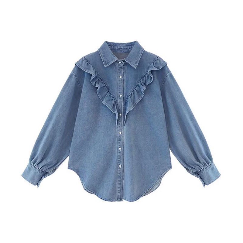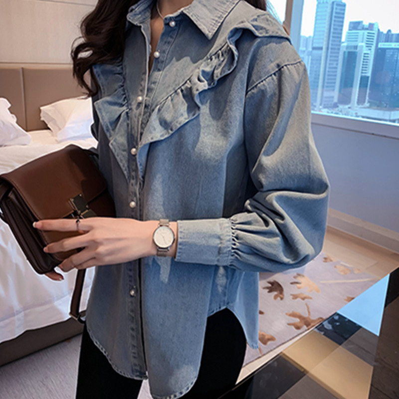 荷叶边牛仔衬衫 秋冬女装 减龄显瘦打底衬衣宽松大码 发长袖 潮 批新款