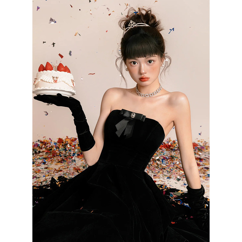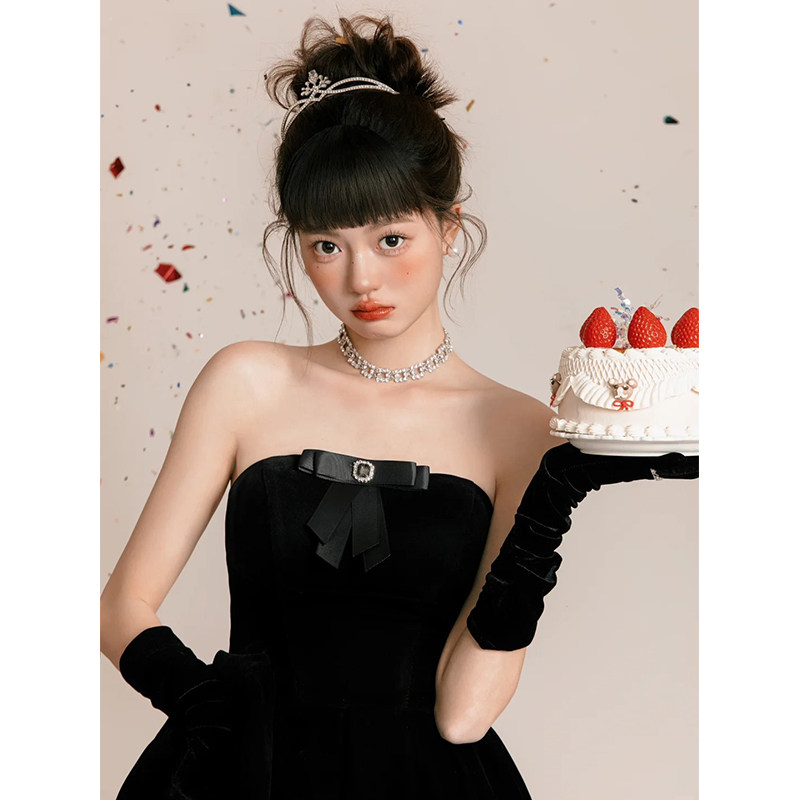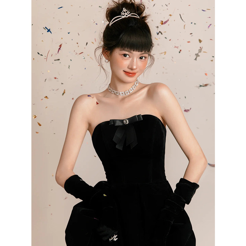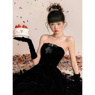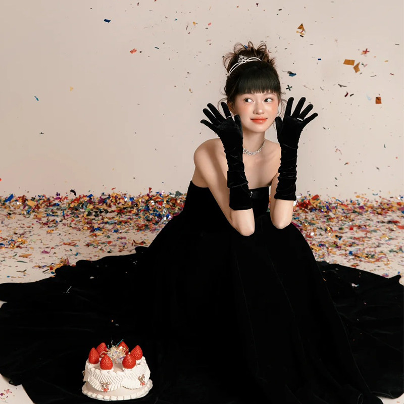 黑色丝绒长款 赫本风复古礼服配饰高级感 手套婚纱新娘拍照道具法式