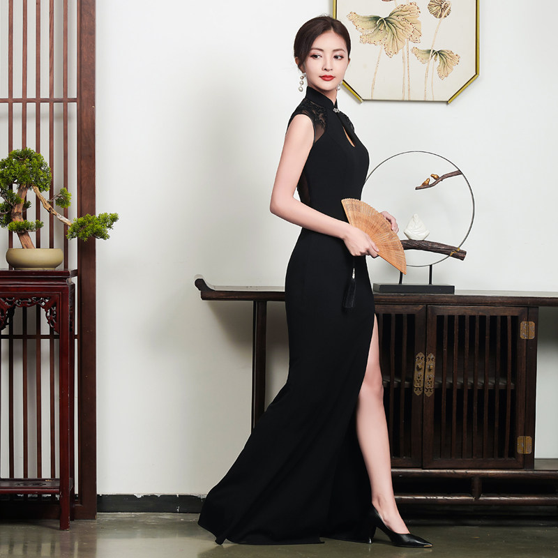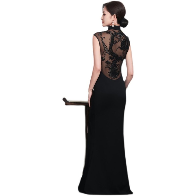 江南春天原创高端旗袍2025年新款 春夏黑色镂空龙绣花性感演出服女