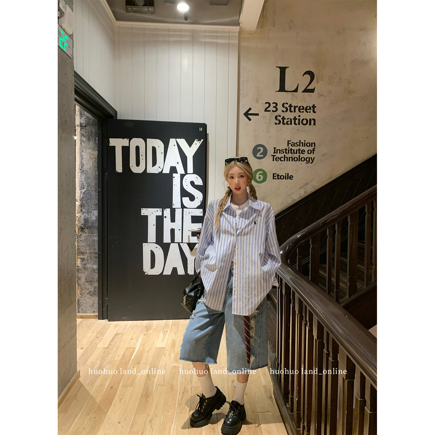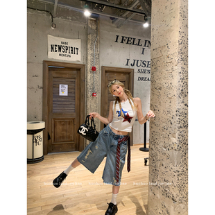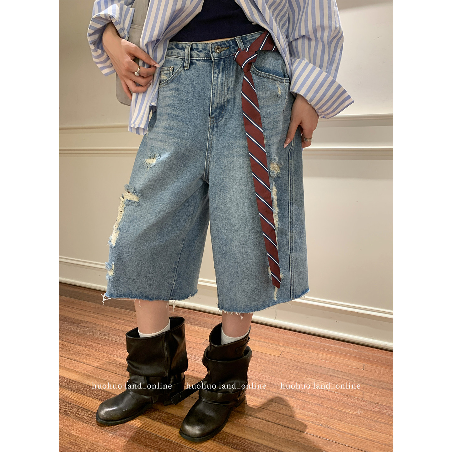 街头风小众休闲阔腿裤 HuoHuo 女夏季 毛边破洞牛仔中裤 自由松弛