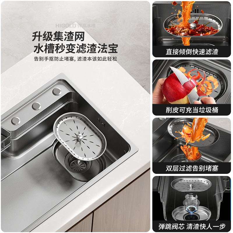 悍高厨房双阶水槽304不锈钢家用洗菜盆多功能厨房日式 收纳大单槽