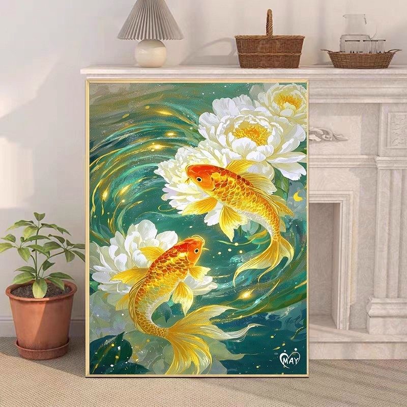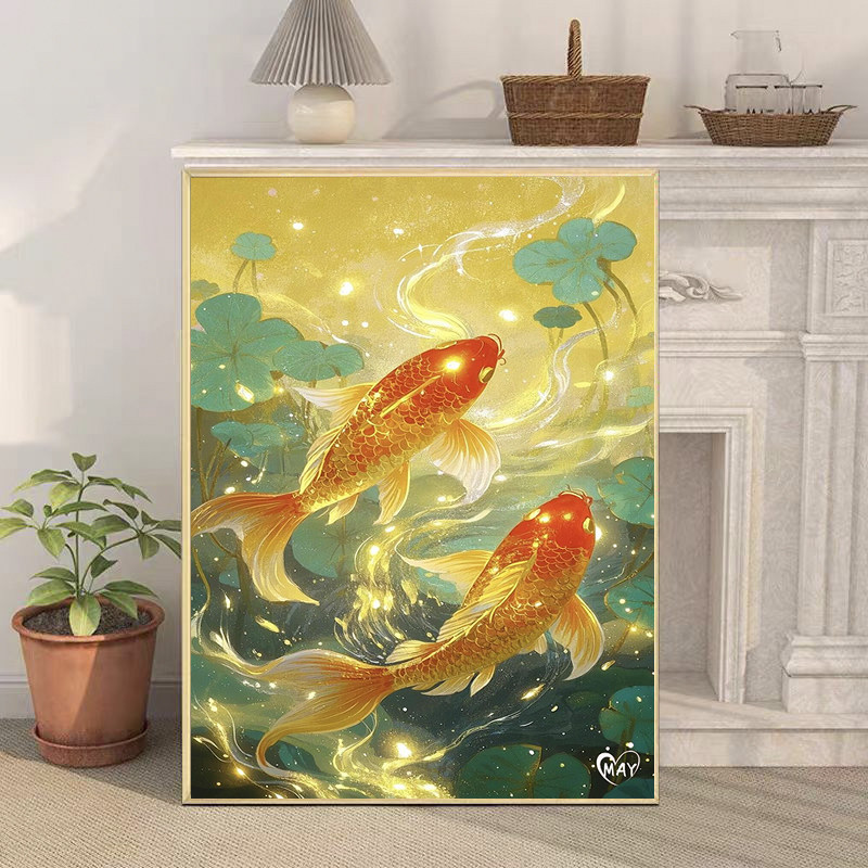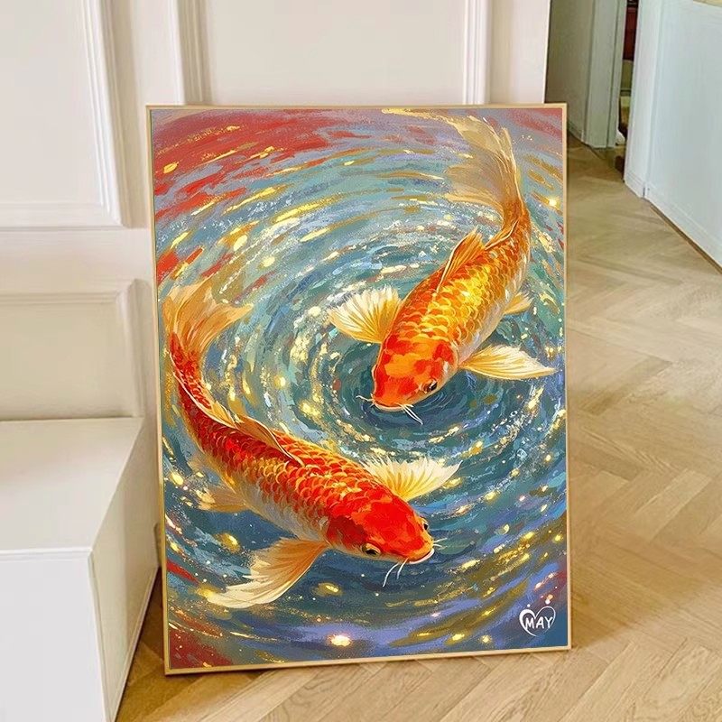 荷花锦鲤装 饰画双鱼图好运卧室客厅镇宅鲤鱼仿油画水彩成品挂摆画
