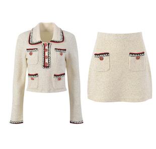 法式 象牙白翻领轻熟设计粗花呢外套半裙复古两件套 名媛小香风套装