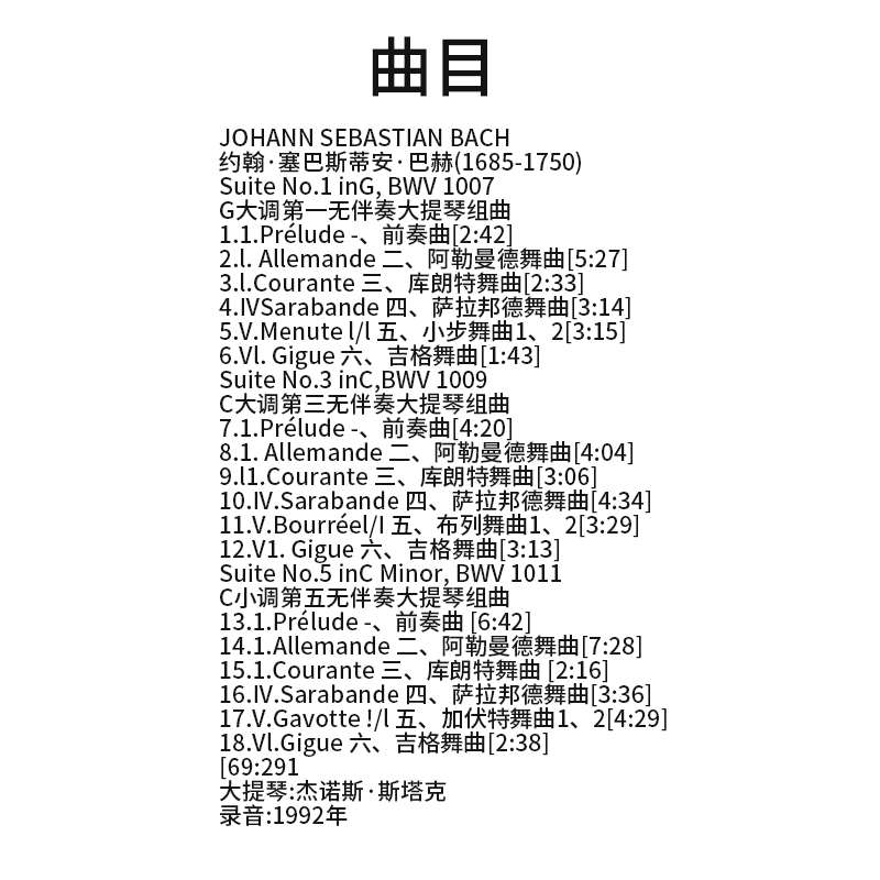 无伴奏大提琴组曲 巴赫 古典CD唱片 BEST100系列