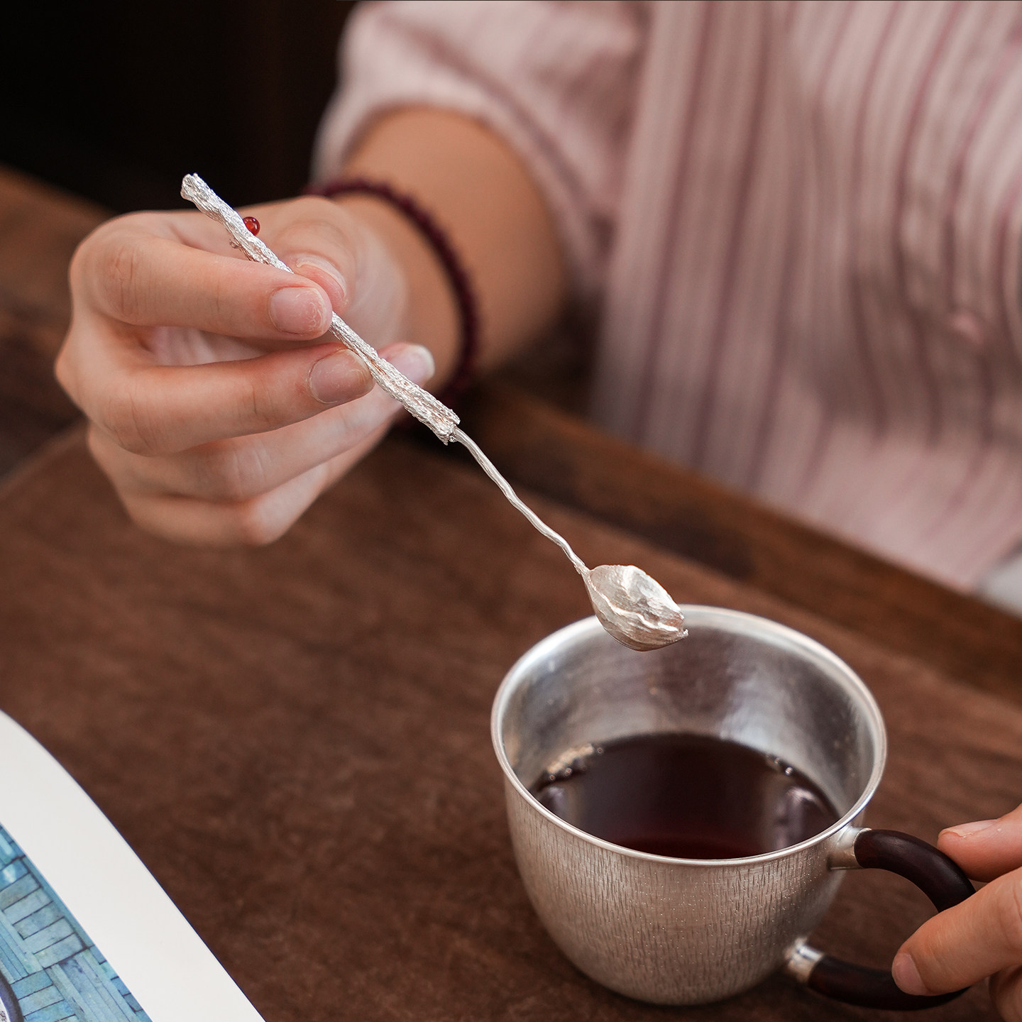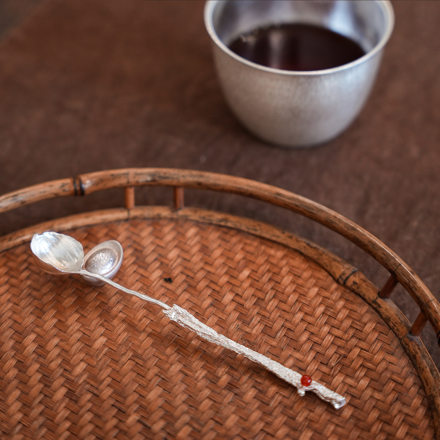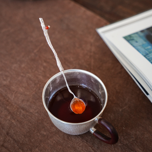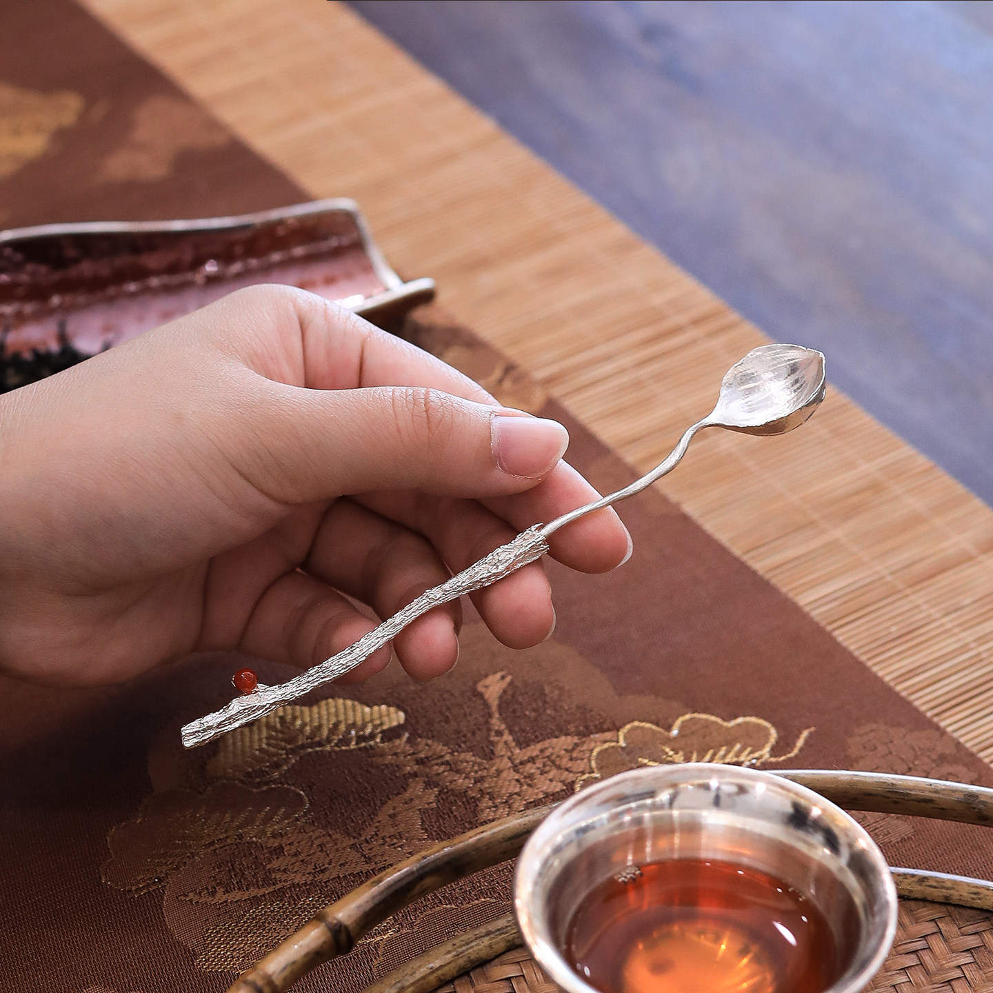 纯银时代 镶嵌红玛瑙茶勺足银999手工咖啡果汁搅拌勺高级精致茶拨