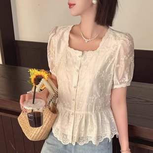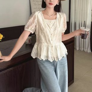 方领收腰蕾丝拼接上衣短袖 MISS 法式 定制 F0678 RUILI