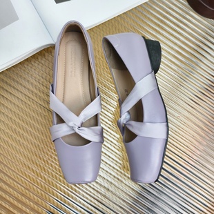 324 慢先森 头层牛皮交叉绸缎丝带芭蕾女复古方头浅口低跟单鞋