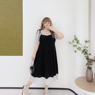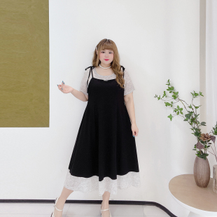 黑色假两件吊带连衣裙 胖莹莹夏季 300斤撞色A字收腰显瘦特大码 女装
