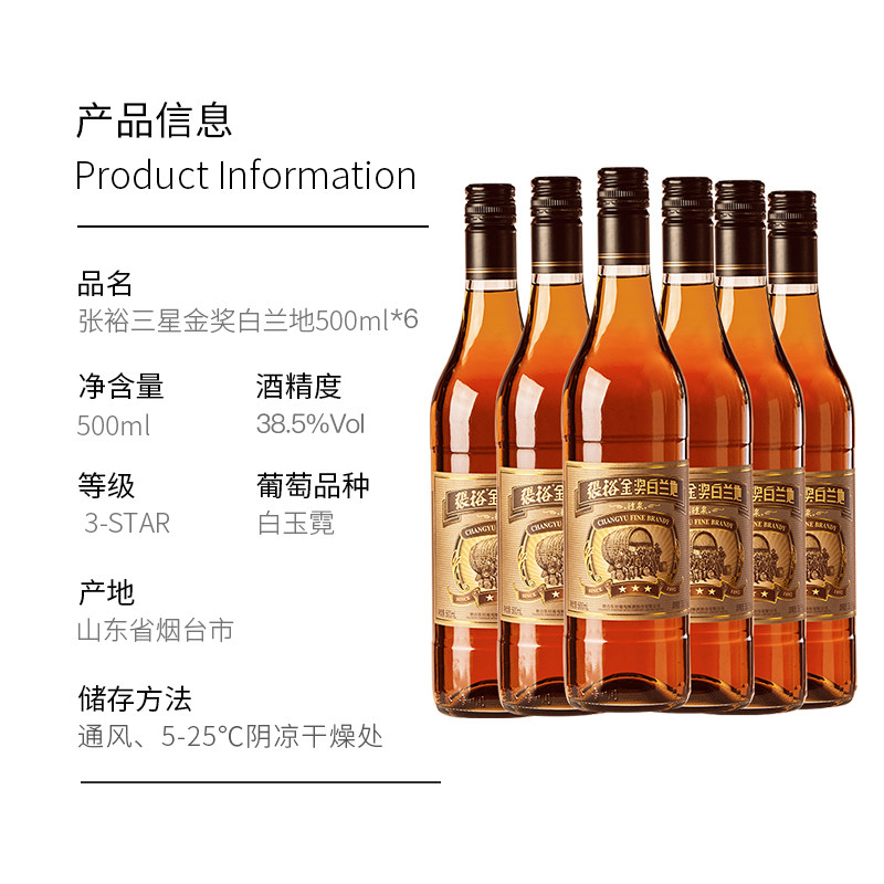 整箱正品 6瓶 餐酒聚会 500ml 张裕三星金奖白兰地38.5%vol