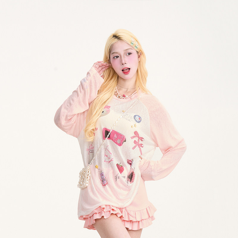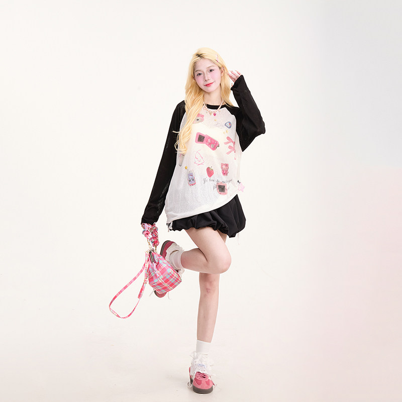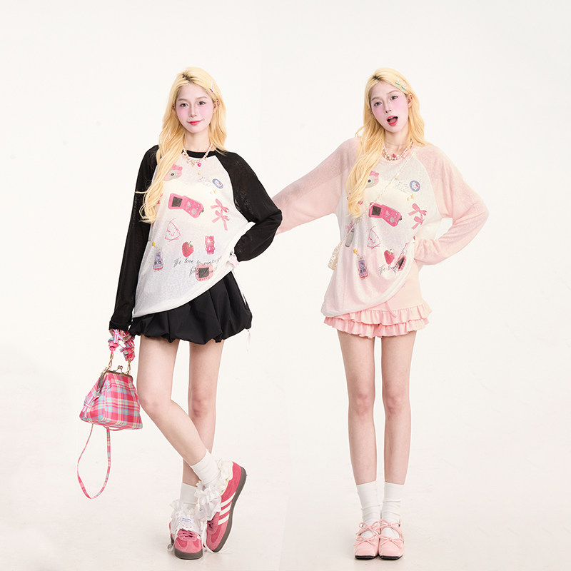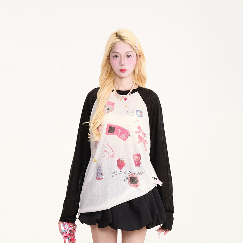 防晒罩衫 微透减龄夏季 上衣 T恤女美式 NERESUM趣味印花撞色插肩长袖
