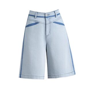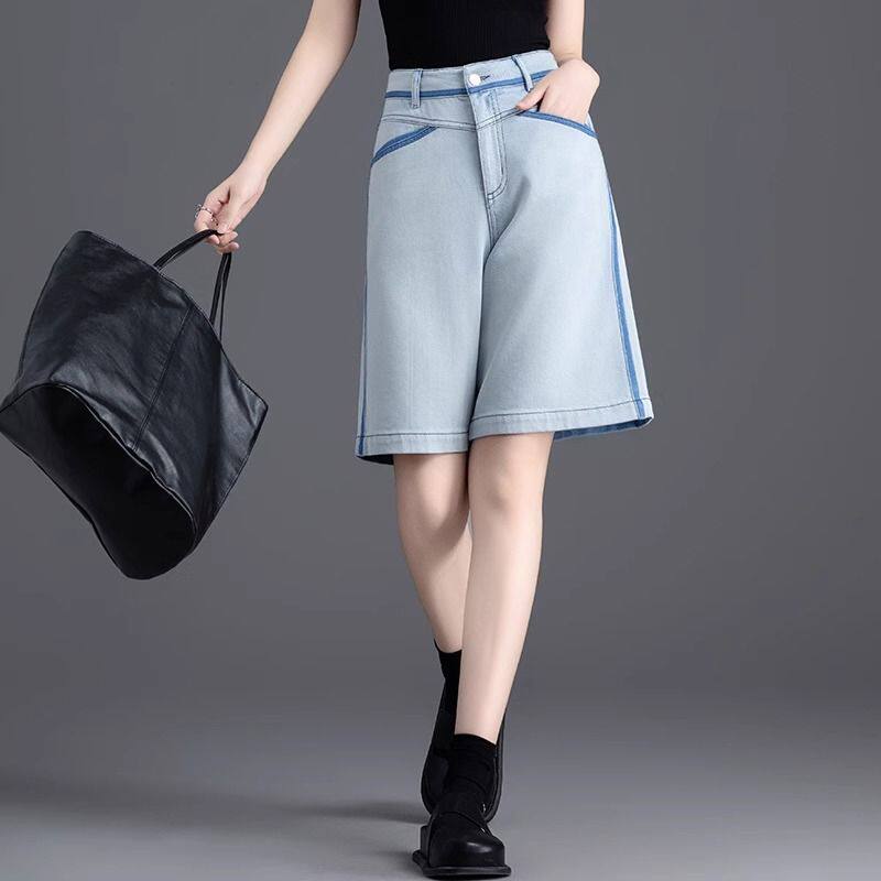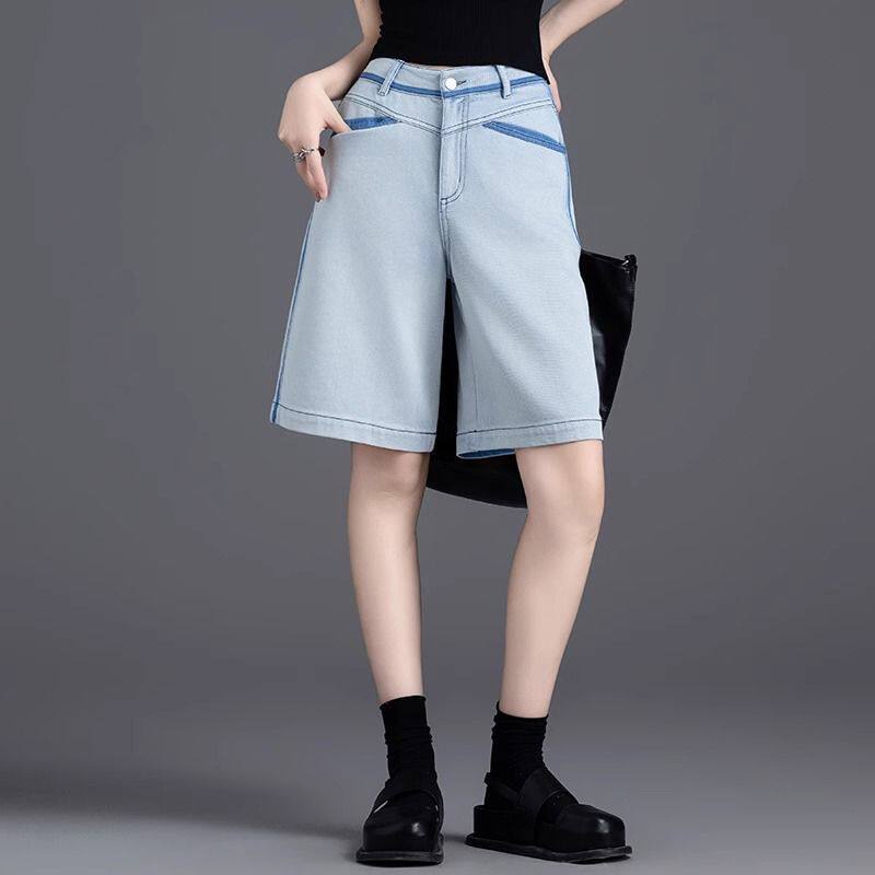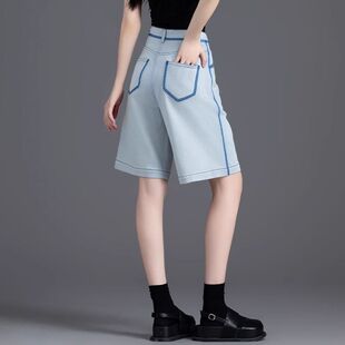 夏季 宽松五分裤 薄款 高腰热裤 浅蓝撞色牛仔短裤 阔腿中裤 女2026新款