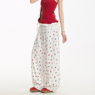 宽松裤 NERESUM蝴蝶结猫咪满印休闲裤 夏季 慵懒速干直筒裤 子 女美式