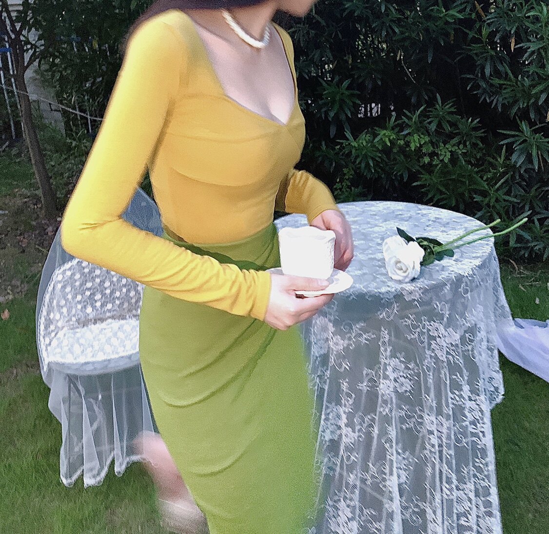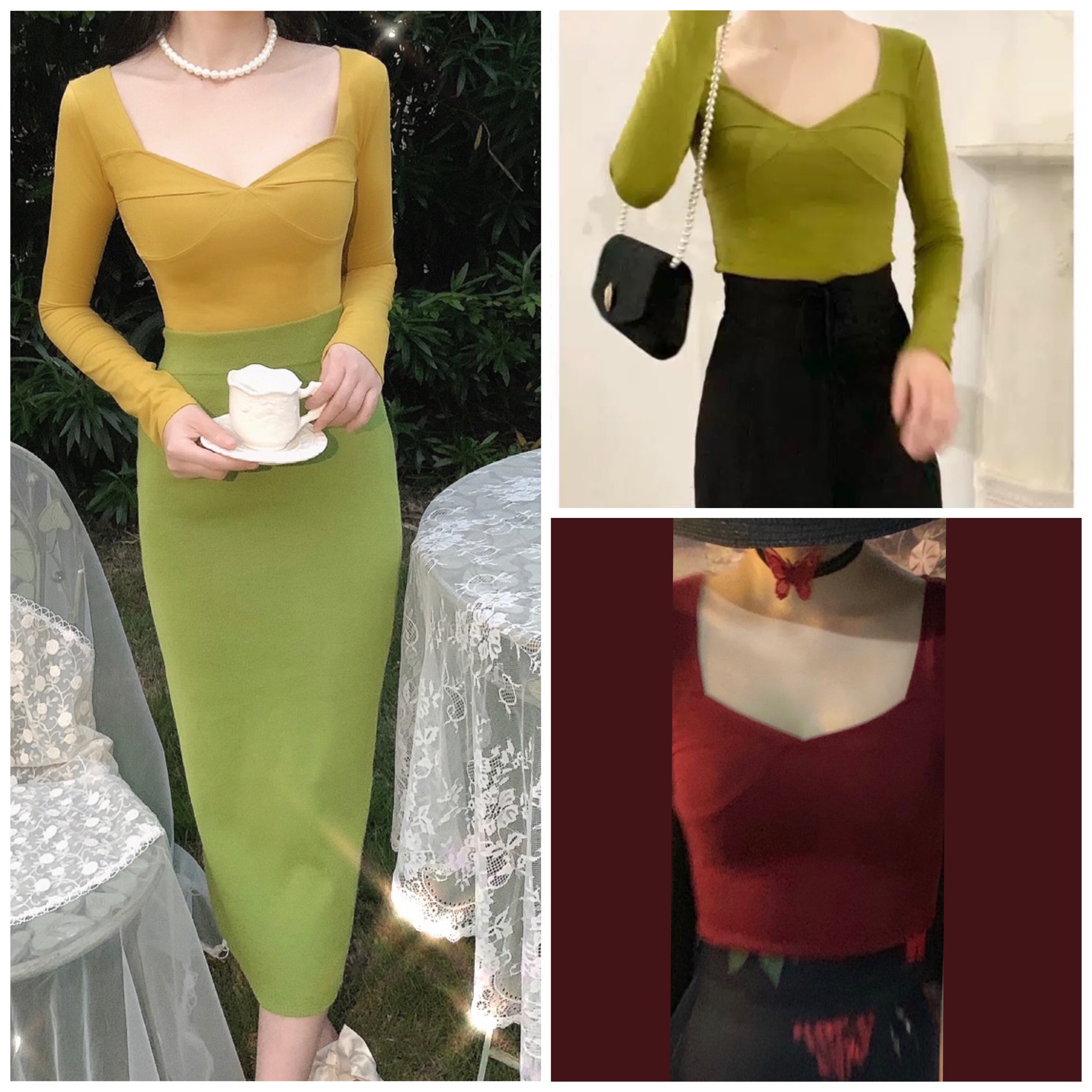 显瘦长袖 显白芥绿色V领女人味泡泡袖 T恤上 秒杀 晚时光