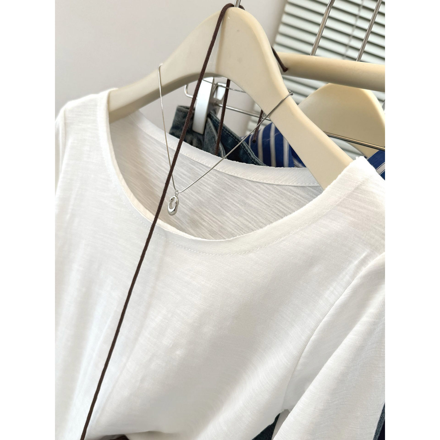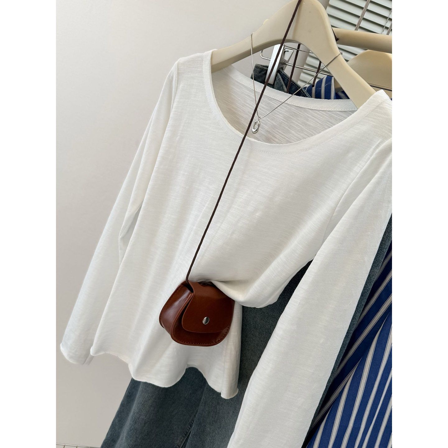 内搭打底衫 大领口U领卷边长袖 修身 韩版 竹节棉白色上衣 T恤女春秋季