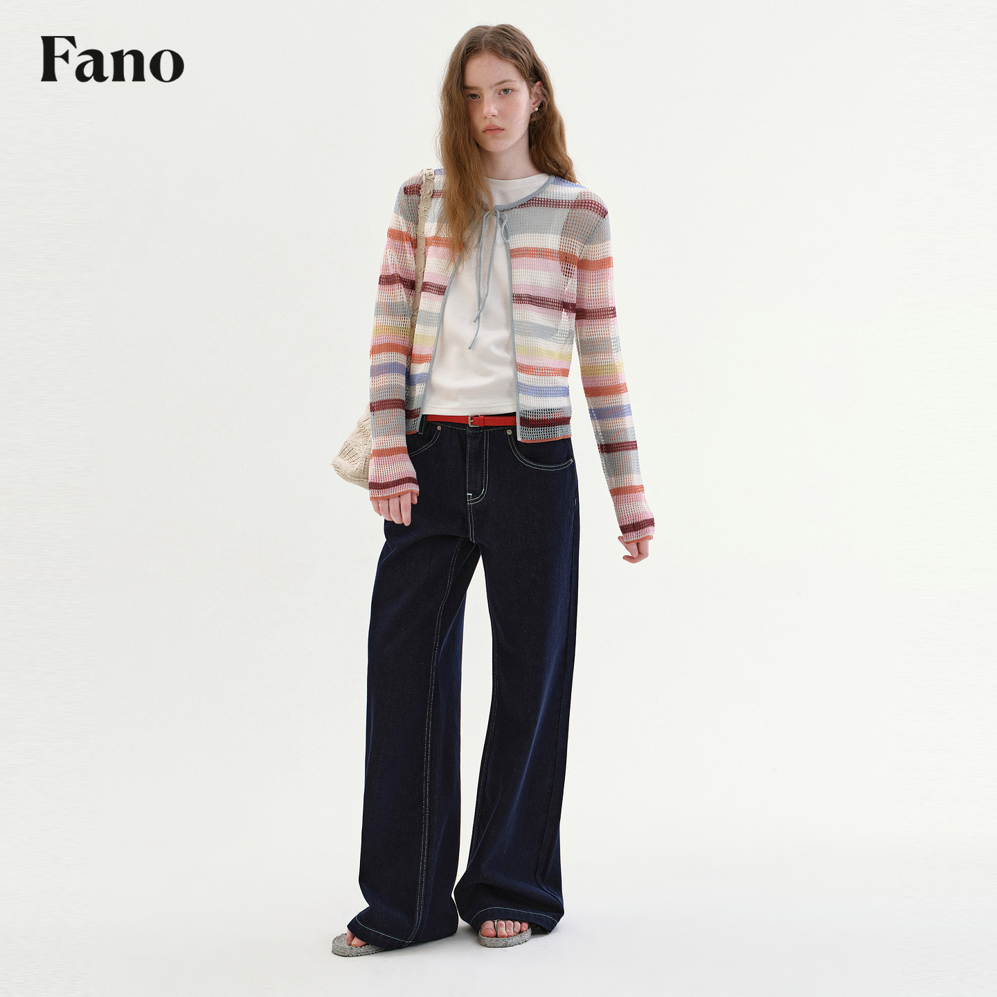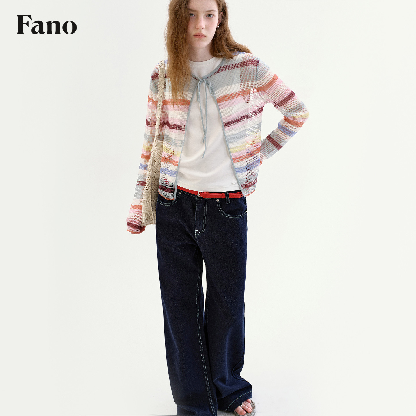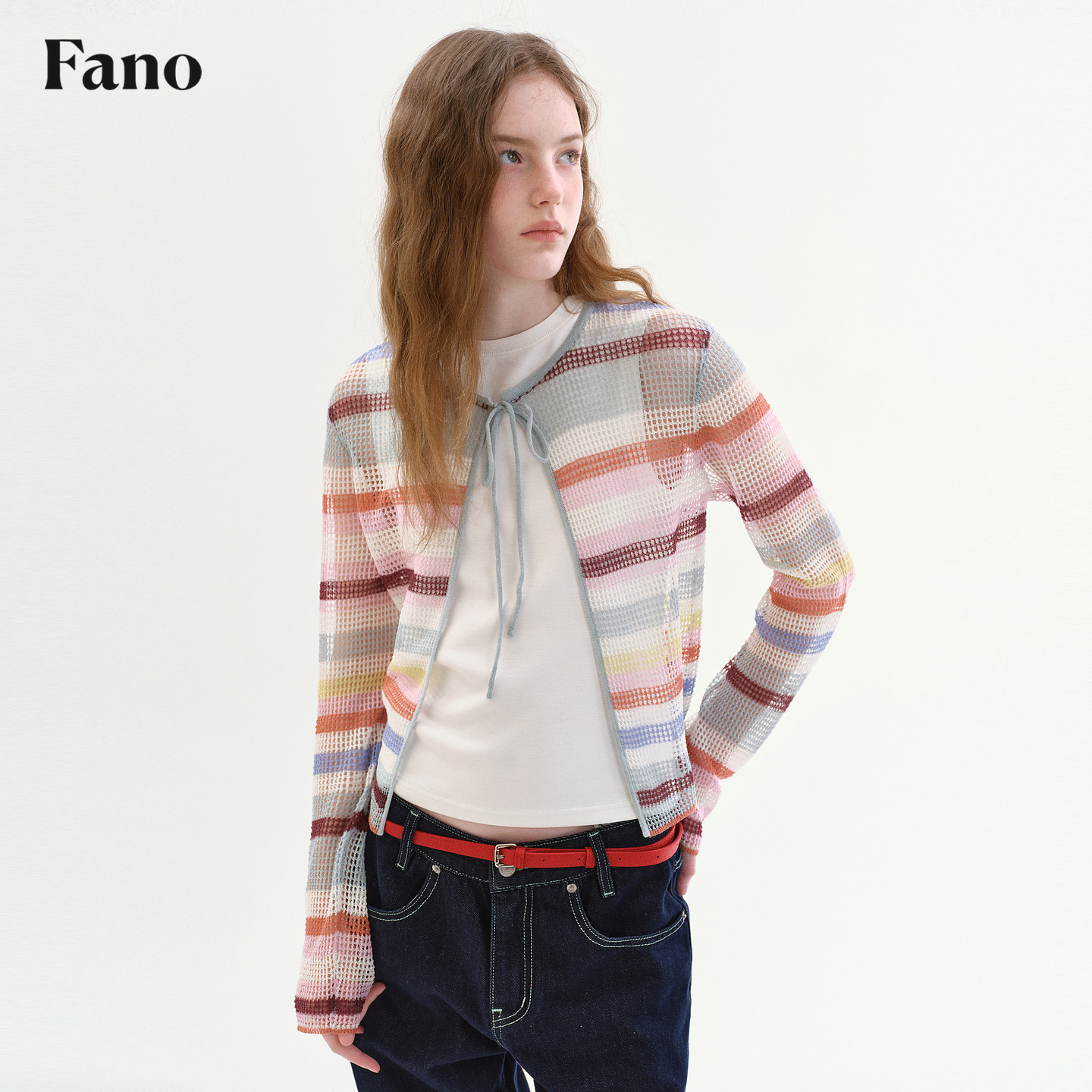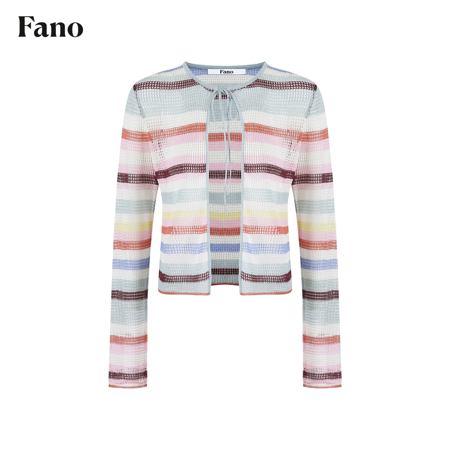 圆领绑带薄款 范洛Fano 新款 女2026春季 上衣 撞色条纹镂空针织开衫