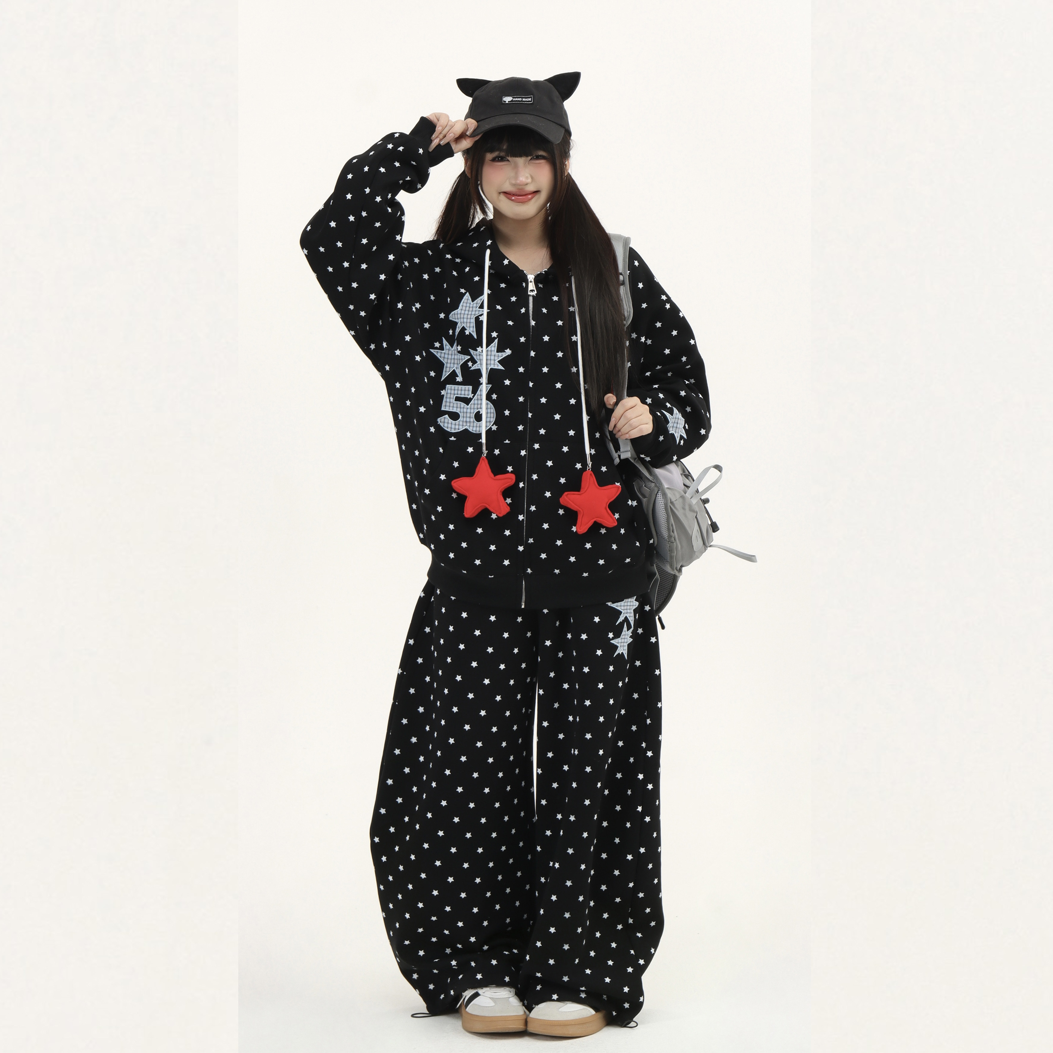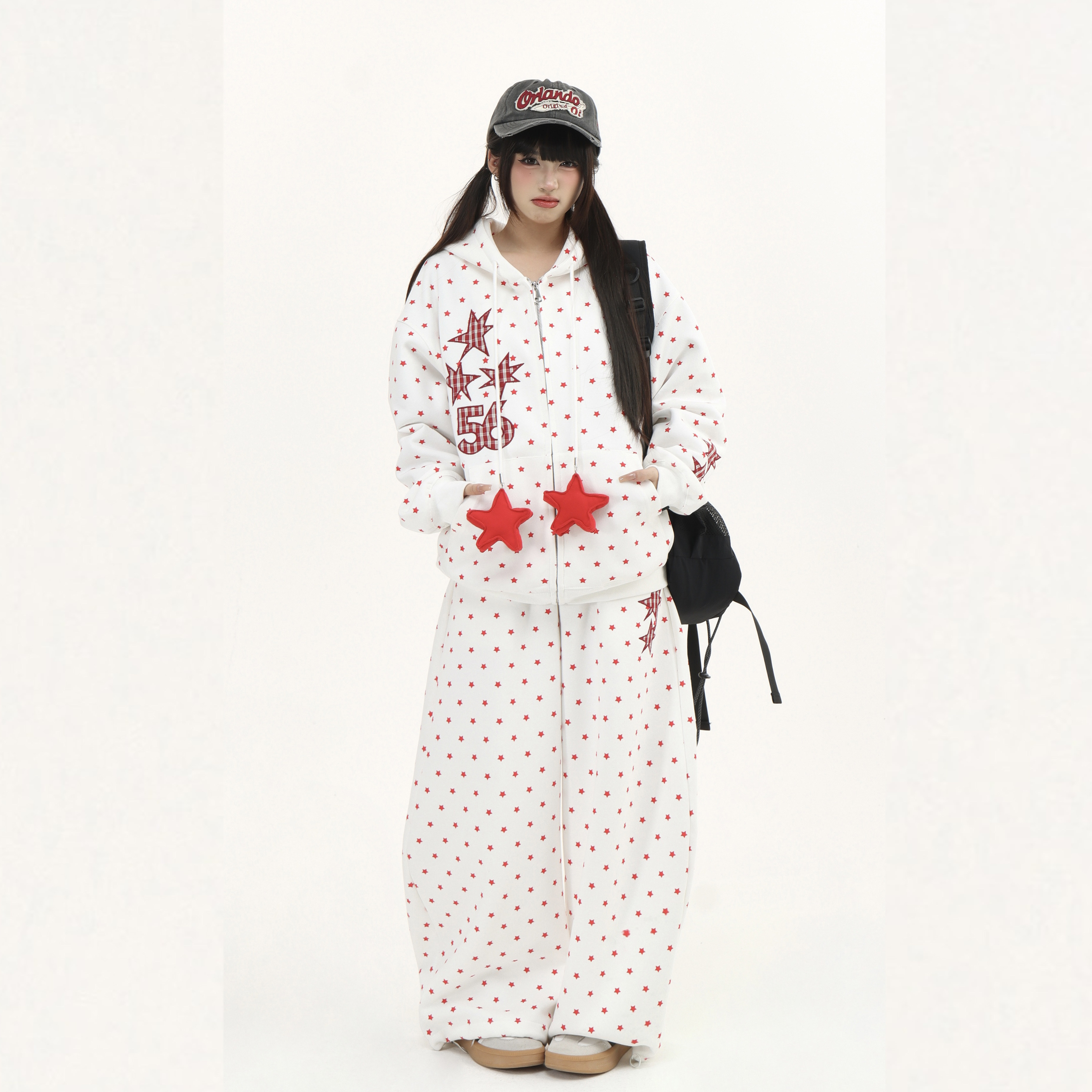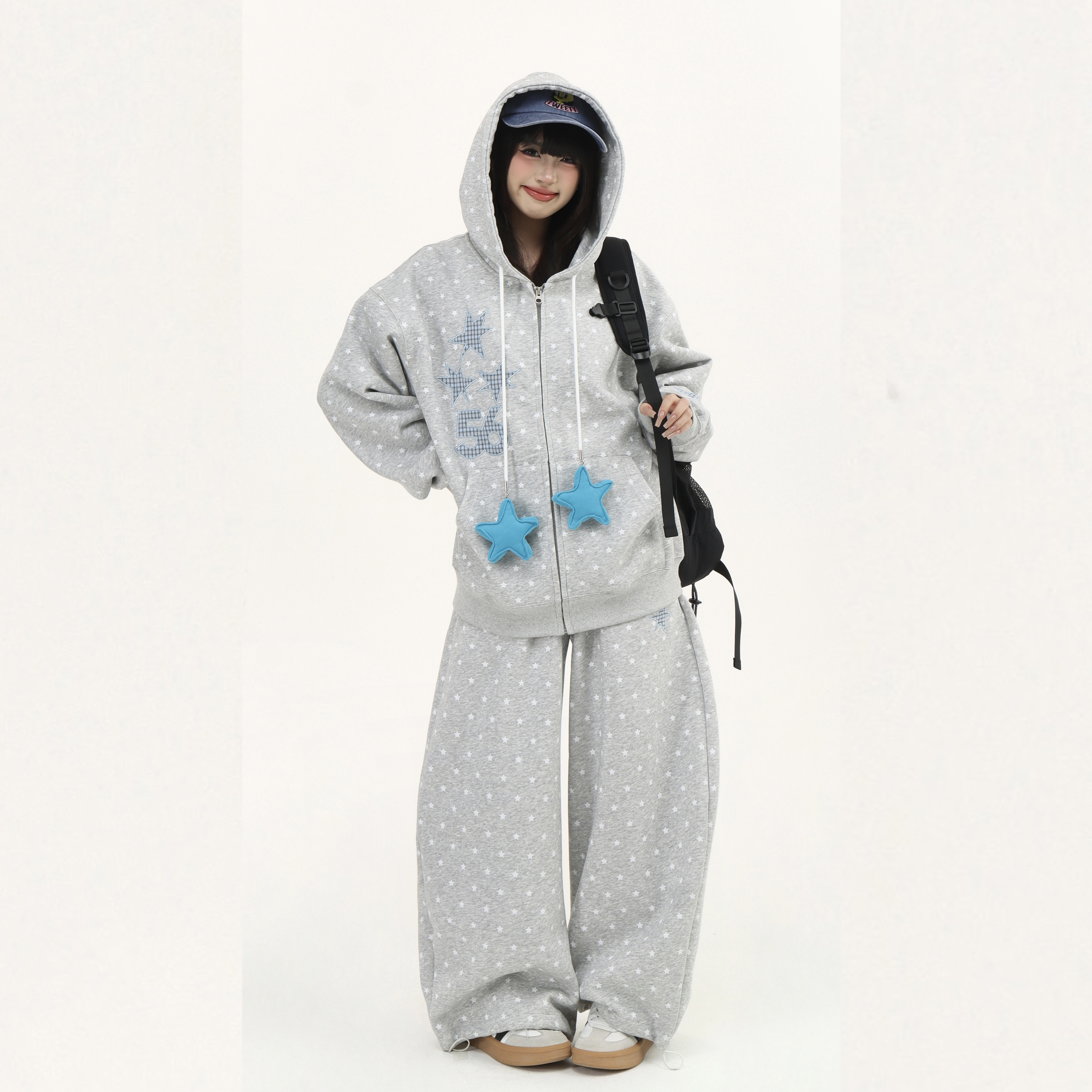 两件套 外套男女休闲阔腿卫裤 零碎岛屿美式 原创星星满印连帽开衫
