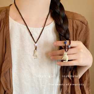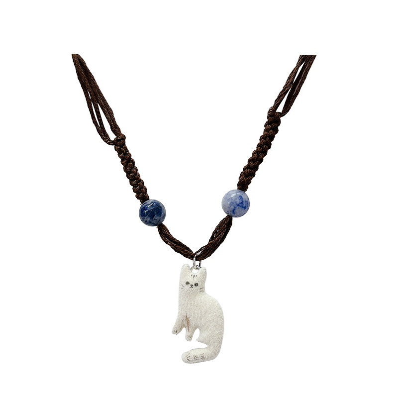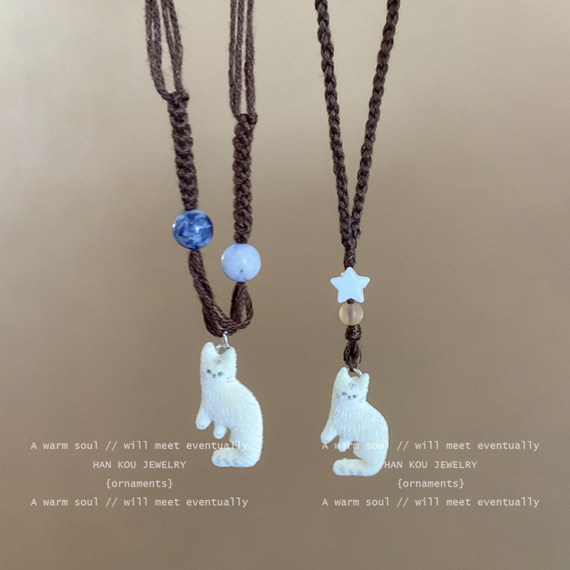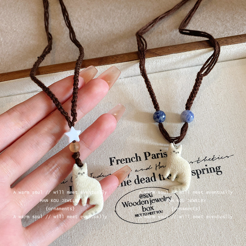 植绒猫咪吊坠编织绳项链配饰女轻奢小众高级感挂脖个性 毛衣链 长款