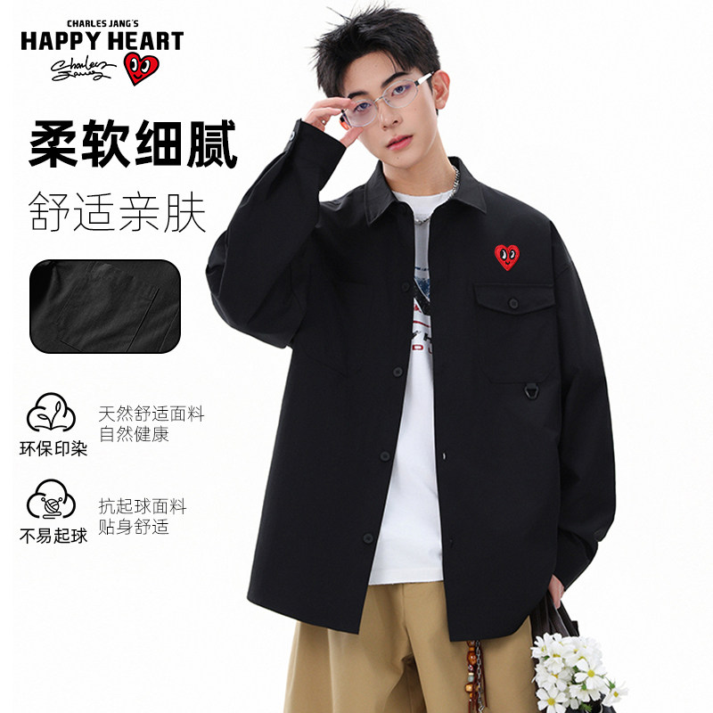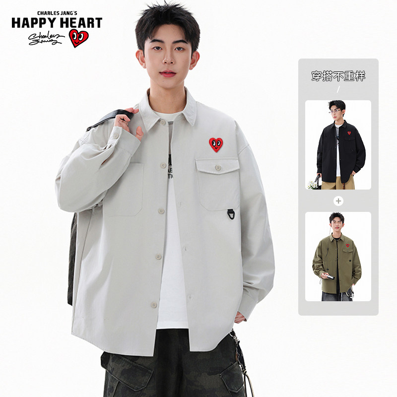 美式 男春秋季 工装 衬衫 衬衣爱心刺绣休闲外套 纯色长袖 查尔斯桃心