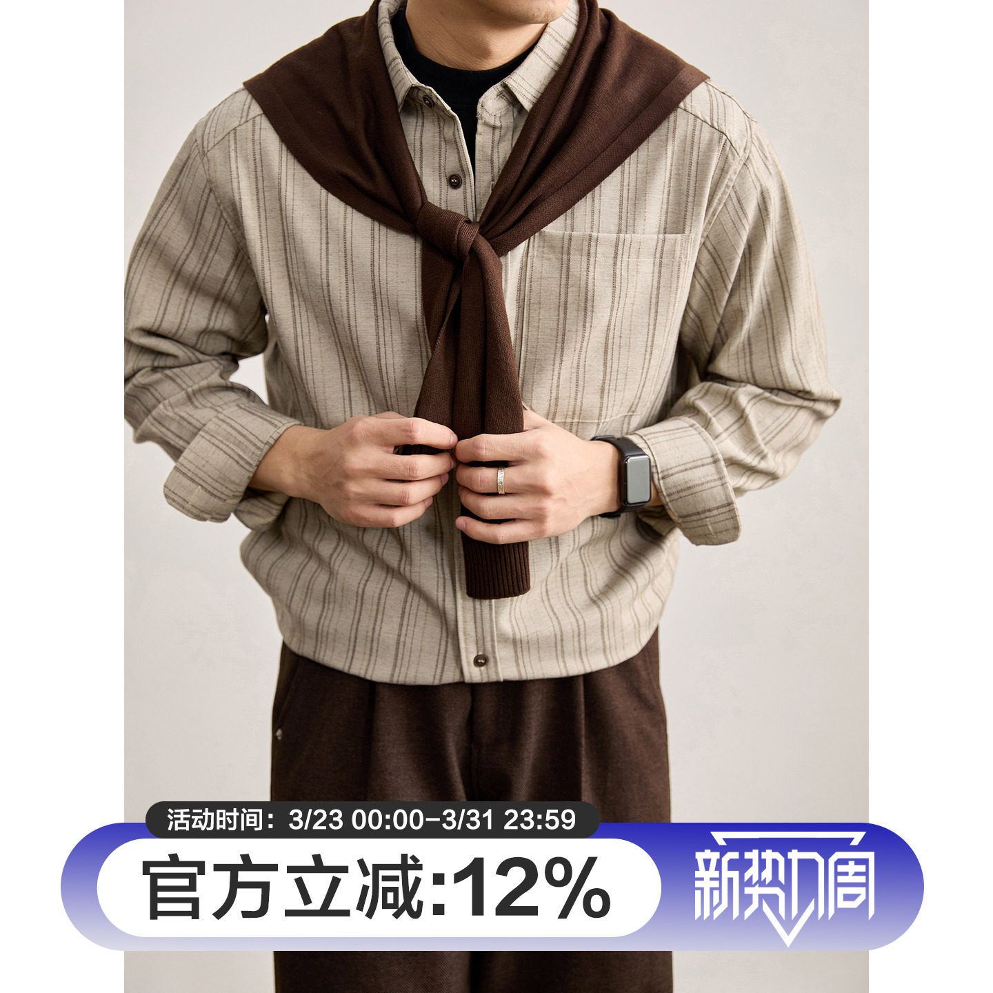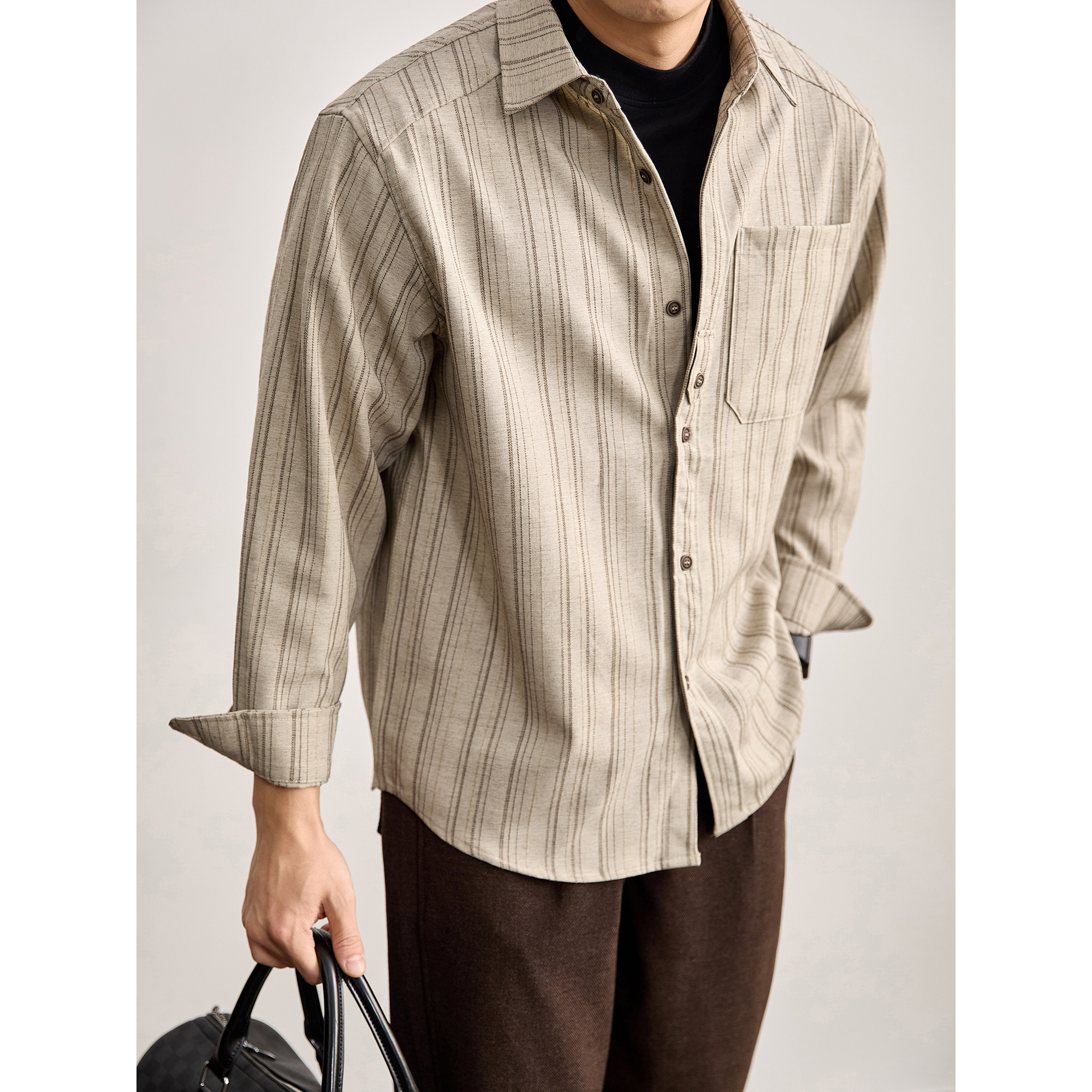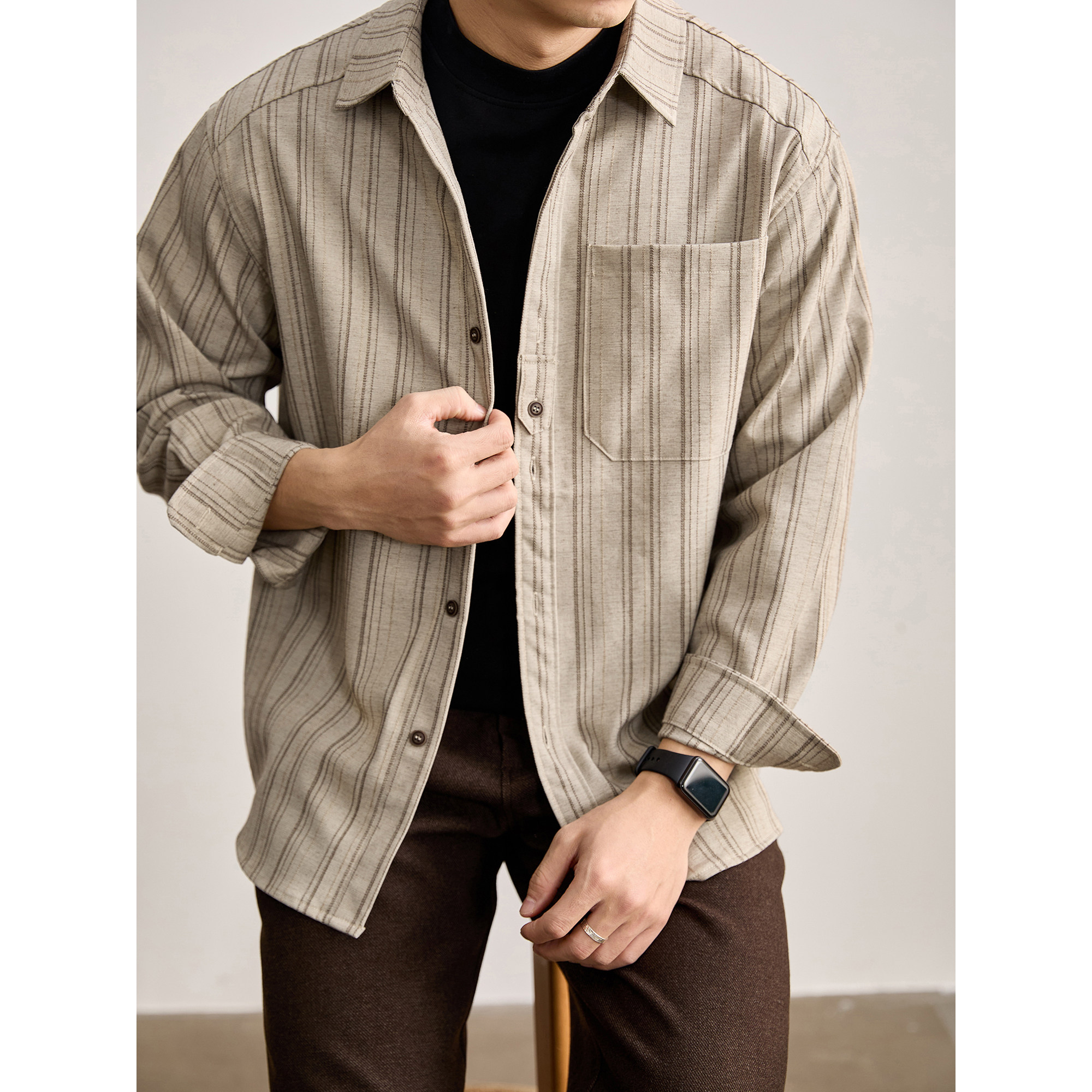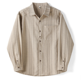 薄款 LUUD 轻奢通勤单贴袋春季 男士 衬衣外套 色织纱线条纹翻领衬衫