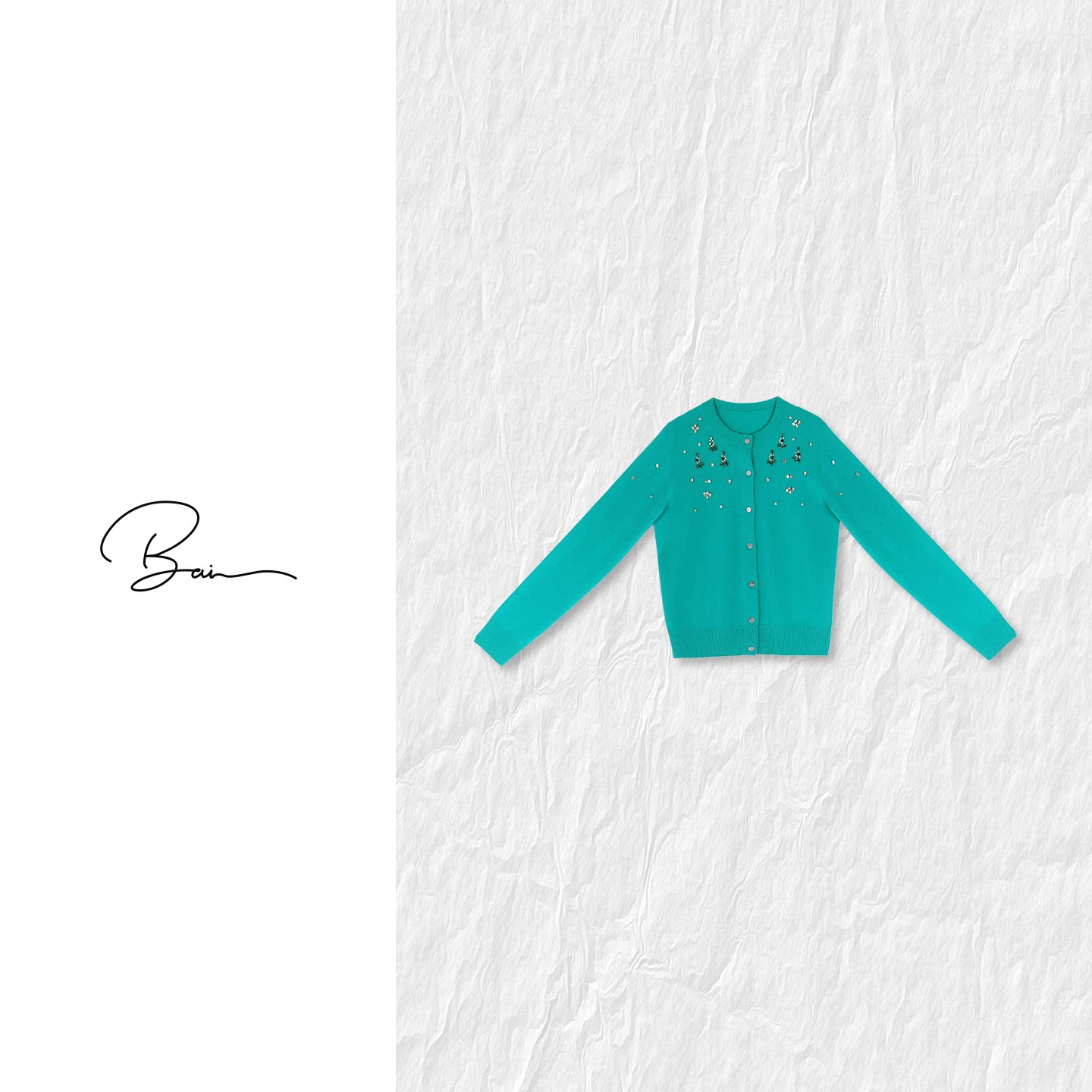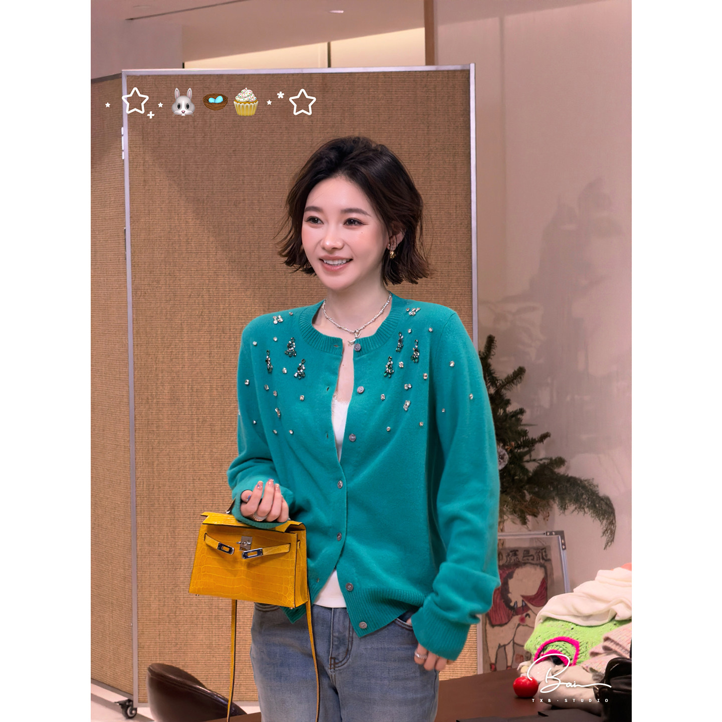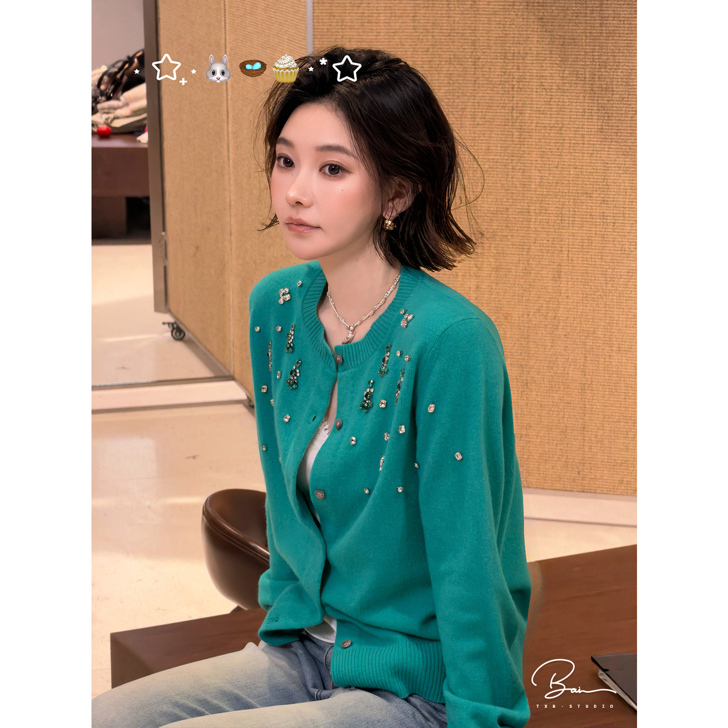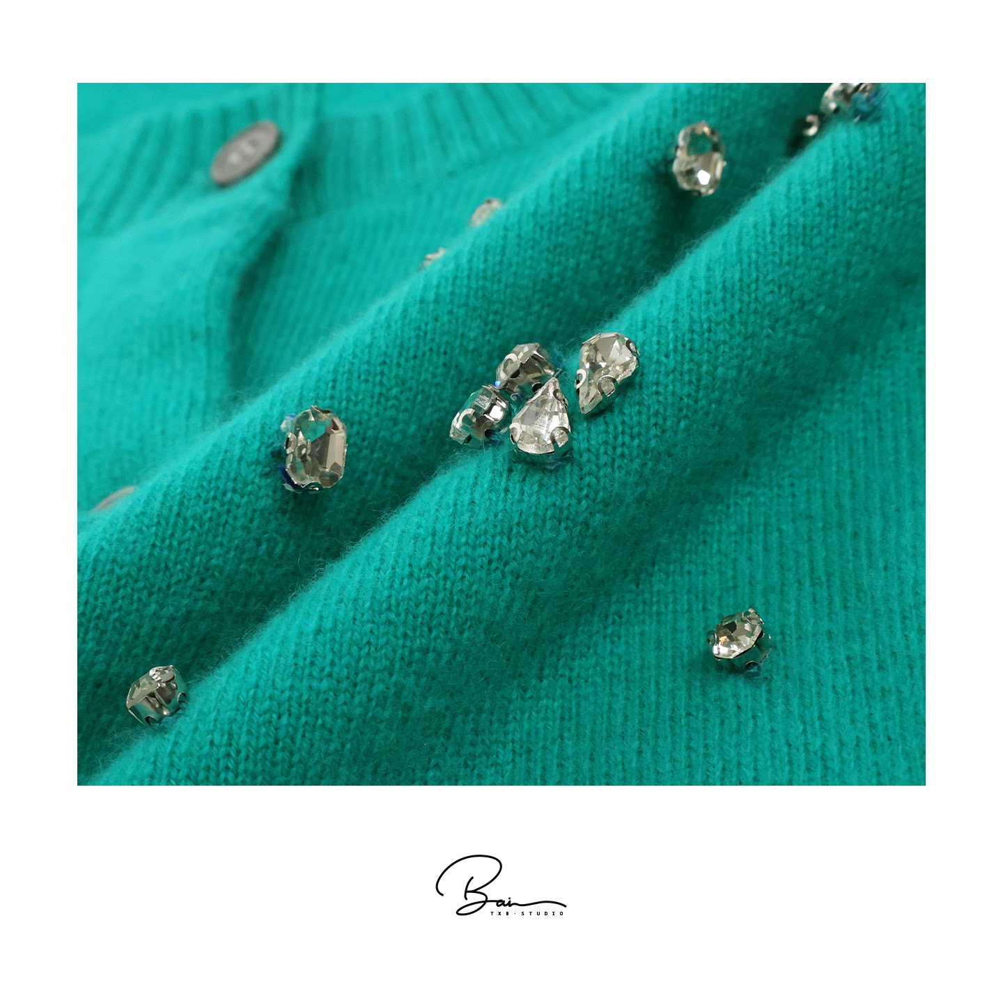 100绵羊毛手工水钻绿色圆领针织开衫 佟小白TXB 宝石蓝钻