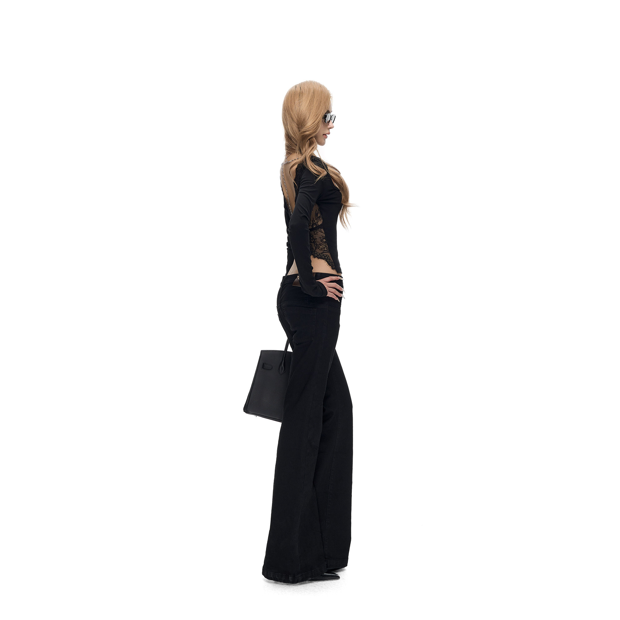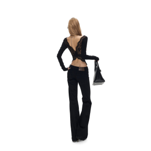 Fanptntox 弹力后背蝴蝶蕾丝可调节链条针织上衣女 大u领显瘦修身